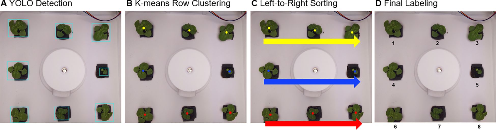 First, based on the vertical position () of the center coordinates, K-means clustering (k=3) was applied to classify plants into three rows: top, middle, and bottom (Figure 4B). Within each row, plants were then sorted from left to right according to their horizontal positions () (Figure 4C). The final labeling sequence was thus defined as: top row (left → right) → middle row (left → right) → bottom row (left → right) (Figure 4D).