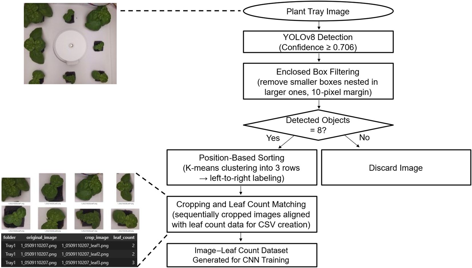 Figure 5. Automated pipeline for generating cropped plant images with matched leaf count labels for CNN model training, using YOLOv8 detection and preprocessing.
