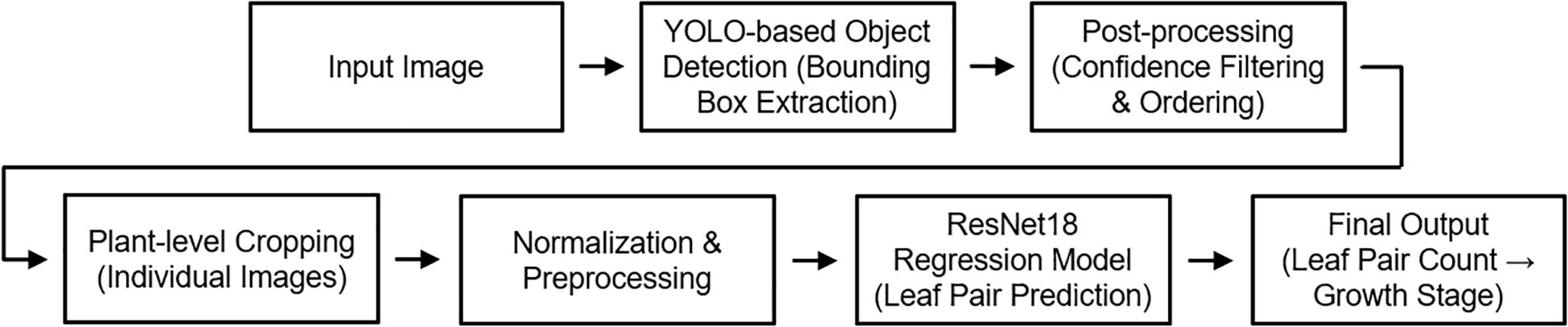 Figure 6. Integrated inference pipeline for plant growth stage classification. YOLOv8 detects individual plants, ResNet-18 regression estimates leaf-pair counts, and predictions are converted into discrete growth stages.