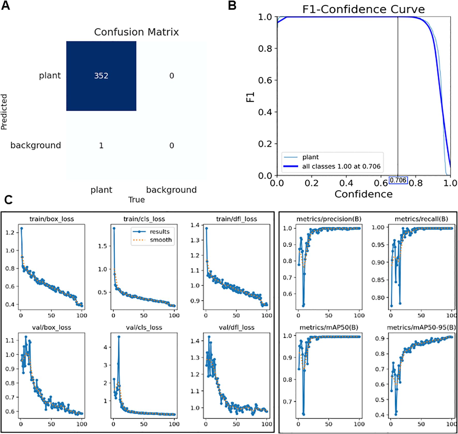 The confusion matrix (Figure 7A) summarizes detection outcomes for the 20% validation set (44 images with approximately eight plants per image), which contained 353 annotated plant instances. The model correctly detected 352 instances with no false positives and only one missed plant, corresponding to Precision = 1.000 and Recall = 0.997.