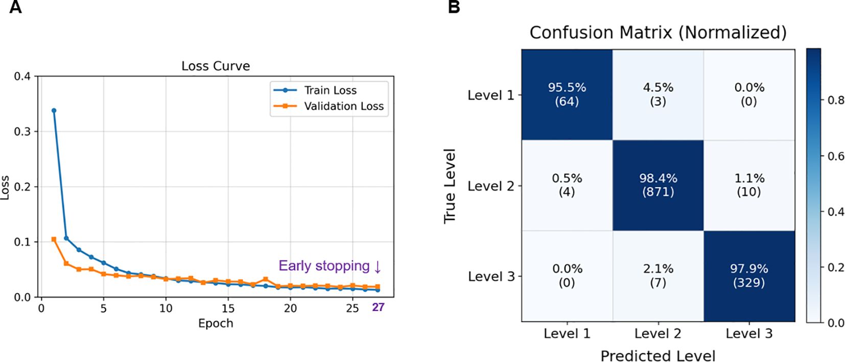 Figure 8. Model training and classification performance. (A) Training and validation loss curves showing stable convergence, with early stopping triggered at the 27th epoch to prevent overfitting; (B) Normalized confusion matrix for Level 1–3 classification on the test set, indicating high prediction accuracy across all levels.