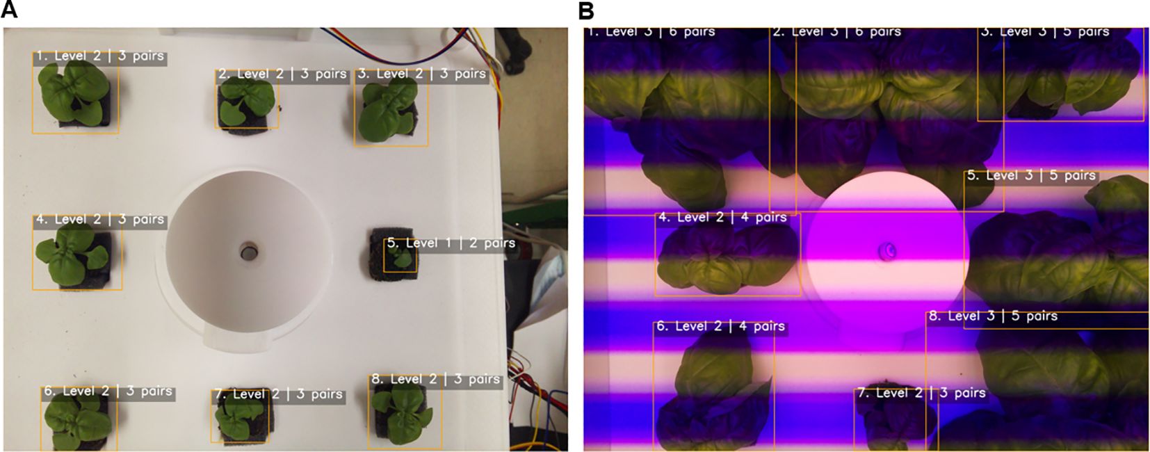 Figure 9. Automated growth stage classification of basil plants. (A) Cultivation bed 1, showing detection and classification of individual plants based on leaf-pair counts; (B) Cultivation bed 4, demonstrating stable multi-plant detection and classification under artificial lighting. Bounding boxes denote individual plants, and labels indicate the predicted growth stage (Level 1–3) and leaf-pair number.