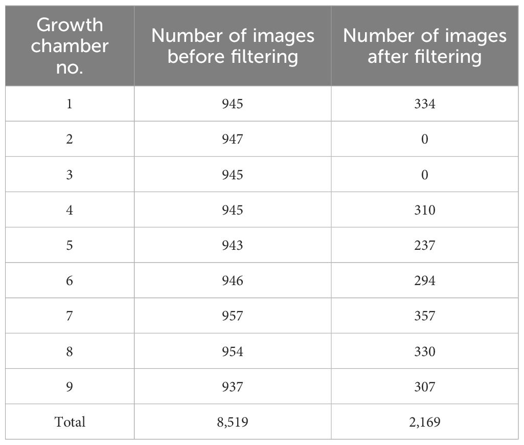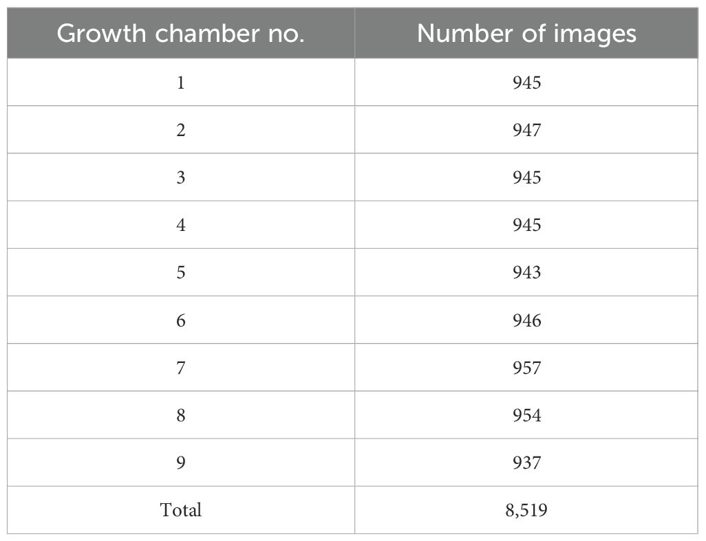 Data was collected from April 20 to May 31, 2024. A total of 8,519 images were collected from nine growth chambers under varying light conditions (Table 1). The differences in the number of images among chambers were attributed to variations in the start and end times of operation for each device.