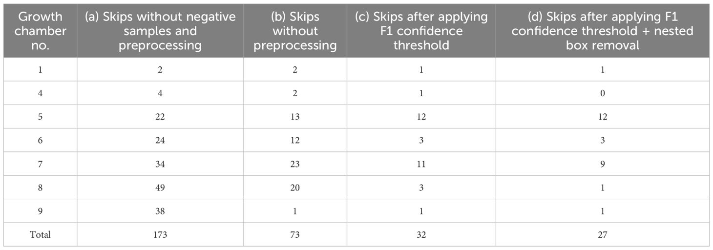 Images were retained as training data only when YOLO successfully detected exactly eight plants; otherwise, the images were discarded to avoid mismatched labels. However, this strict criterion initially resulted in a high skip rate, leading to substantial data loss and potential performance decline (Tables 3A, B).