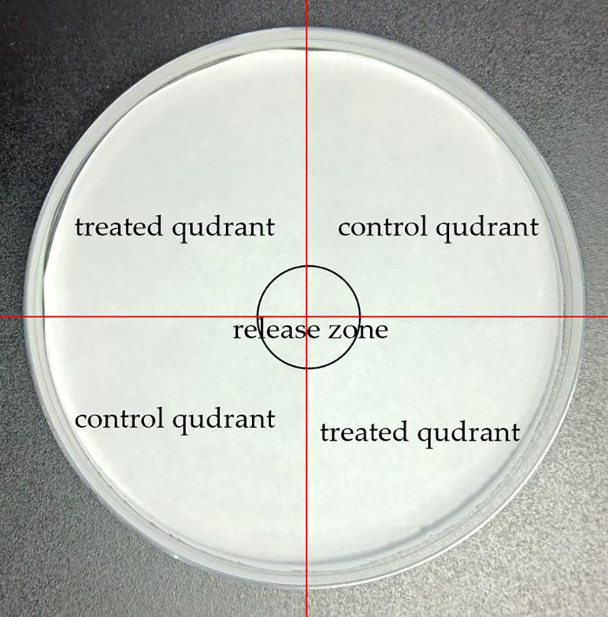 For this assay, the LC50 concentration of the essential oil or chemicals effective against both dust mite species, D. pteronyssinus and D. farinae, was used. For each candidate chemical, a circular filter paper was divided into four equal quadrants with a central release zone, where two opposite quadrants were treated with 100 μL of test compounds and the other two served as 100 μL of solvent controls (Figure 1); mites were counted manually under a dissecting microscope by a trained observer at specified time points, with treatment labels blinded to minimize bias. A growth medium was placed on the filter paper for 5 minutes to allow its components to equilibrate with the test surface and maintain a stable microenvironment mimicking dust mite habitats, before being removed to isolate the treated area for behavioral observation. Subsequently, 30 adult mites were gently transferred using a brush to the compound-treated area of the cloth to avoid damage. Ethanol alone served as the control. Repellency was calculated using the following formula.