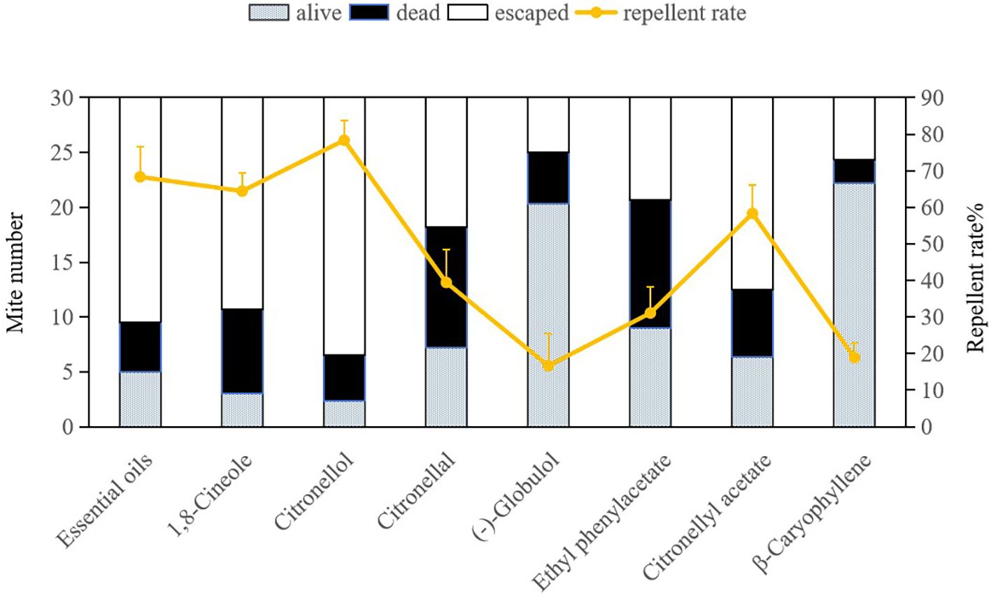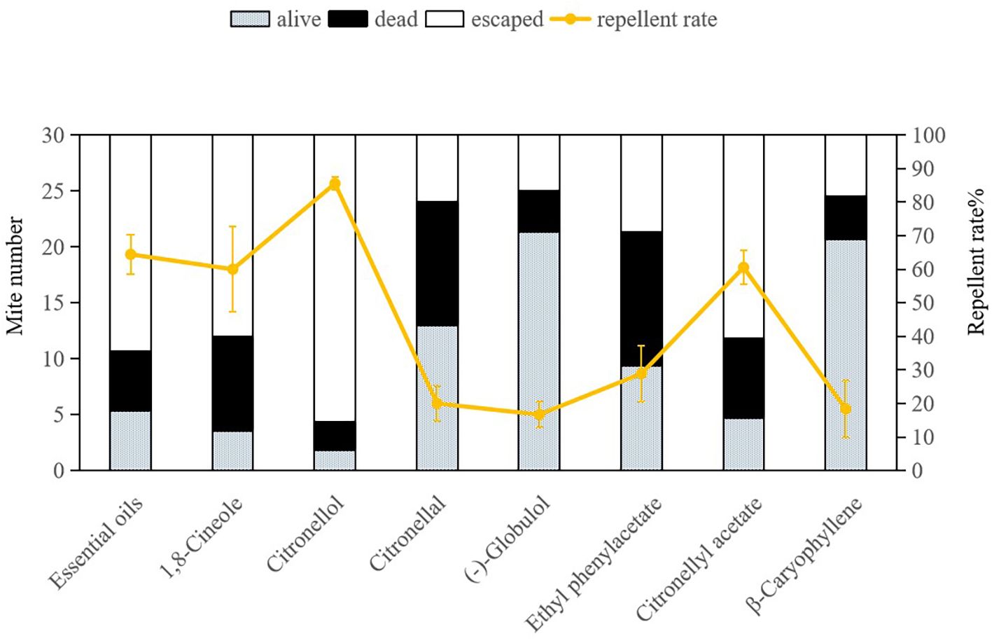 The repellent bioassay revealed that citronellol exhibited the highest repellent efficacy against D. pteronyssinus and D. farinae, with mean repellency rates of 85.56 ± 2.14% and 78.33 ± 1.89% at 60 min post-treatment, respectively. These values were significantly higher than those of other tested compounds. These findings indicated that citronellol is likely the principal contributor to the repellency of E. citriodora essential oil. The essential oil, 1,8-cineole, and citronellyl acetate also showed significant repellent effects, with repellency rates above 50%. Previous study also demonstrated that citronellol, 1,8-cineole, and citronellyl acetate repelled insects and mites (Han et al., 2011; Deletre et al., 2022; Ayllón-Gutiérrez et al., 2023; Kaneko et al., 2024; Kunnathattil et al., 2024; Yan et al., 2024).
