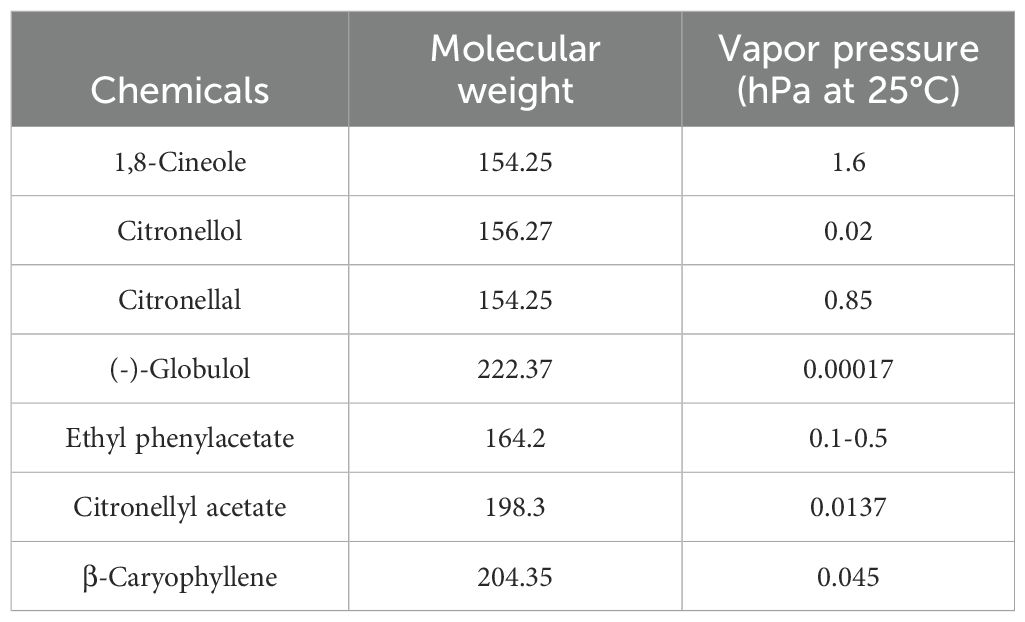 Essential oil of Eucalyptus citriodora Hook was purchased from Xiya Reagent, Shangdong, China. The seven artificial chemicals used in the study were listed in Table 1. For the quantitative structure-activity relationship (QSAR) analysis, the molecular weight (MW), vapor pressure (VP), and steric parameters of the test compounds were derived using ACD/Boiling Point and Vapor Pressure software (ACD/Labs Online, provided by Advanced Chemistry Development, Inc., Montreal, Canada). The calculated values are summarized in Table 1. All chemical reagents employed in the study were of analytical grade and were sourced from Xilong Scientific Co., Ltd., Shangxi, China.