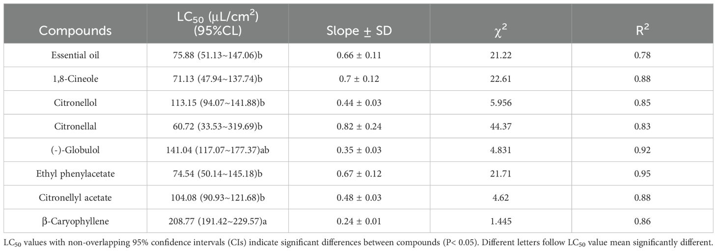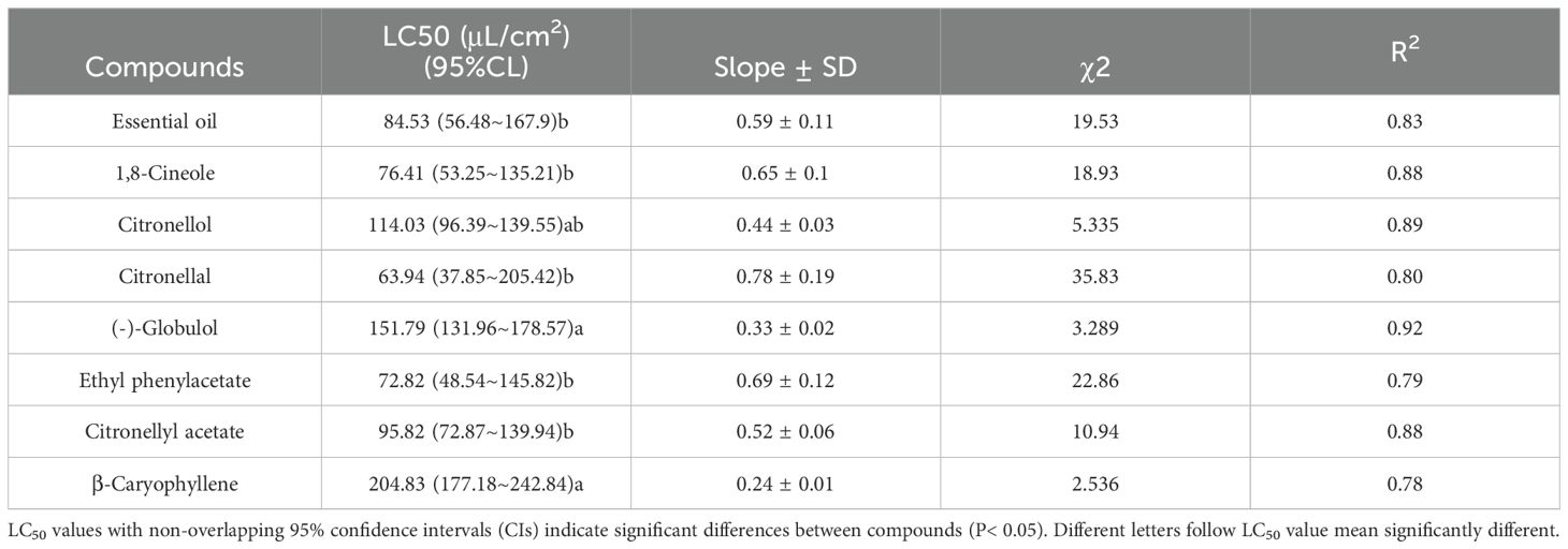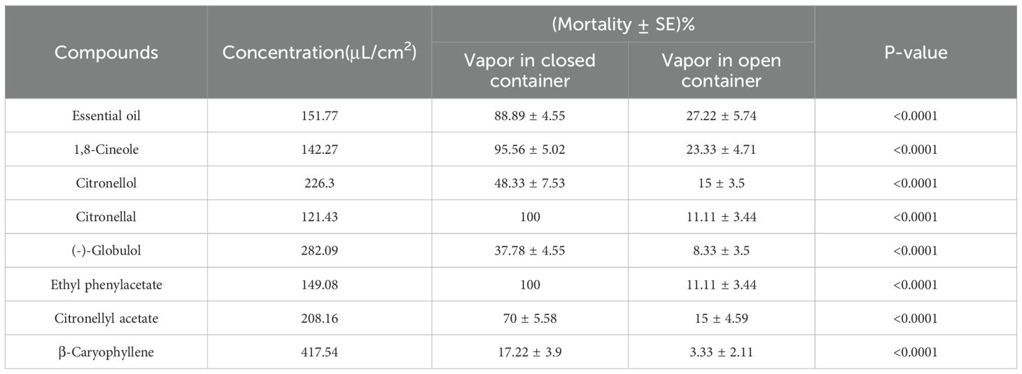 The fumigation efficacy of both the essential oil and its seven principal compounds was evaluated through vapor-phase bioassays conducted at twice the concentration of their respective LC50 values. Mortality rates were analyzed to determine fumigation effectiveness, where a positive correlation was observed between mortality rate and increased toxicity levels across treatments within closed versus open groups (P< 0.0001; Tables 5, 6). Both citronellal and ethyl phenylacetate achieved complete mortality against both Dermatophagoides species under closed conditions, even at the two lowest tested concentrations (127.88 μL/cm² for citronellal and 145.65 μL/cm² for ethyl phenylacetate, Table 5), highlighting their higher efficacy; additionally, the mortality effects associated with essential oils, 1,8-cineole, and citronellyl acetate exceeded 65% in closed containers (Tables 5, 6). This underscores the potential utility of citronellal, ethyl phenylacetate, essential oils, 1,8-cineole, and citronellyl acetate for controlling dust mites via fumigation.