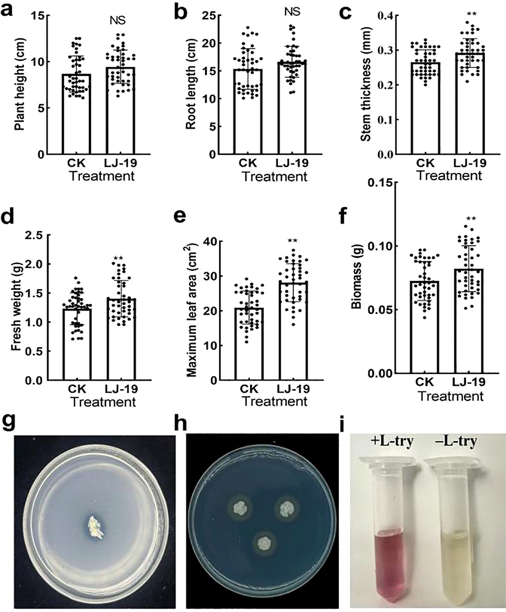 Figure 4. Effect of LJ-19 on cucumber growth. (a-f) Growth promotion of cucumber by strain LJ-19; (g) Phosphate-solubilizing activity; (h) Siderophore production; (i) IAA producing activities. Error bars represent standard deviation (SD) of the mean (n = 45). Significance levels: **, P < 0.01; NS, Non-significant.