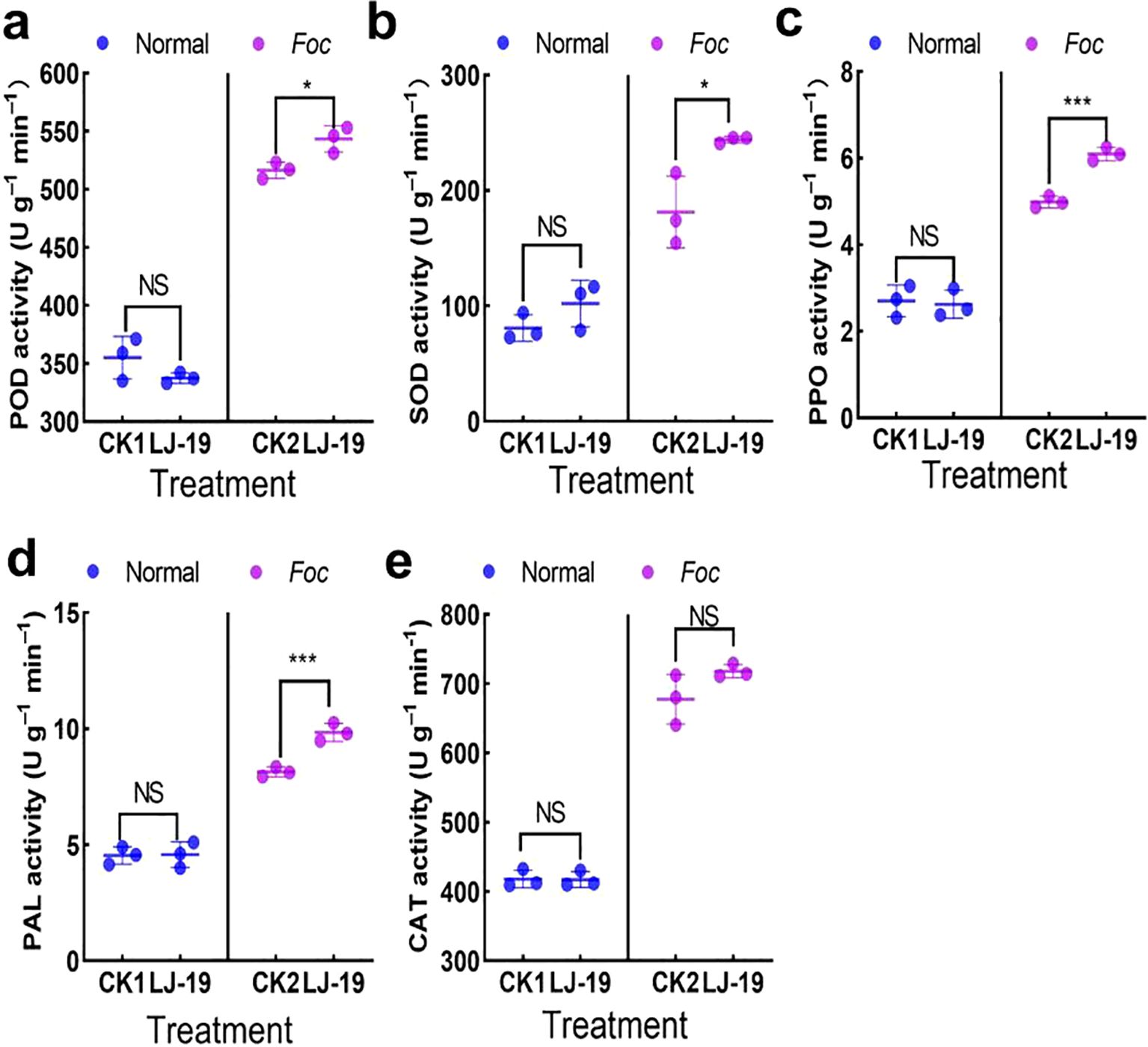 Five scatter plots (a-e) display enzyme activity levels across two treatments: CK1LJ-19 and CK2LJ-19, under Normal and Foc conditions. (a) POD activity shows significant increase with CK2LJ-19 under Foc. (b) SOD activity significantly higher with CK2LJ-19 under Foc. (c) PPO activity significantly elevated with CK2LJ-19 under Foc. (d) PAL activity significantly increased with CK2LJ-19 under Foc. (e) CAT activity shows no significant difference. Significance levels indicated by asterisks: *, ***, NS (not significant).