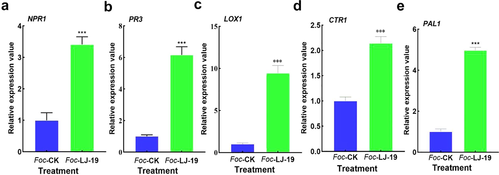 Bar graphs labeled a to e display relative expression values for genes NPR1, PR3, LOX1, CTR1, and PAL1 under treatments Foc-CK and Foc-LJ-19. Green bars (Foc-LJ-19) show significantly higher expression, marked with three asterisks, than blue bars (Foc-CK).