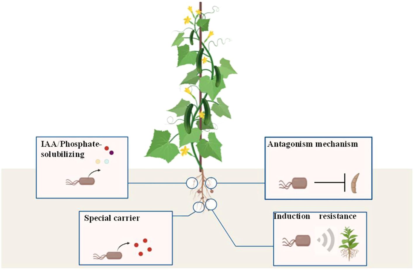 Natural soil microorganisms, including bacteria, fungi, and protozoa, can exert beneficial, pathogenic, or neutral effects on host plants (Ortíz-Castro et al., 2009). Biocontrol agents derived from microorganisms can inhibit plant pathogens through multiple mechanisms, such as niche competition, nutrient rivalry, secretion of antibiotics and volatile compounds, lysozyme production, and induction of plant resistance (Marilley et al., 1998; Sun et al., 2022). When plants are attacked by fungal pathogens, biocontrol agents can help establish a “defense barrier” to combat infections (Trivedi et al., 2022; Hibbing et al., 2010; René et al., 2020). Plant rhizobacteria are an important group of soil microorganisms that play significant roles in promoting plant growth and enhancing disease resistance (René et al., 2020; Wang et al., 2021), thus emerging as a potential approach for controlling cucumber wilt.