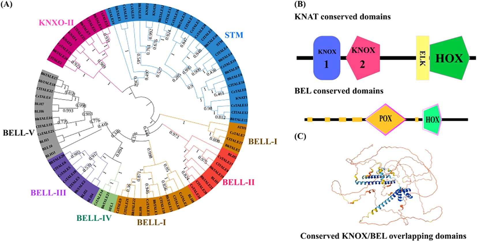 Figure 2. Phylogenetic and structural analysis of the ClTALE gene family. (A) Phylogenetic tree of ClTALE proteins constructed using the Maximum Likelihood method in MEGA 6.0 based on full-length amino acid sequences. Bootstrap values from 1,000 replicates are shown at key nodes. The TALE superfamily is divided into two major classes: the KNOX family (further subdivided into KNOX I and KNOX II) and the BELL family (subdivided into BELL I-V). The tree was visualized and annotated using the Interactive Tree of Life (iTOL) platform. (B) Conserved protein domain architecture of representative ClTALE members. Key domains including KNOX1, KNOX2, ELK, Homeobox (HOX), and POX are indicated by distinct colored boxes. (C) Representative three-dimensional (3D) protein structure model of a conserved region, highlighting the spatial overlap and arrangement of the KNOX and BEL domains. The model was generated using SWISS-MODEL.