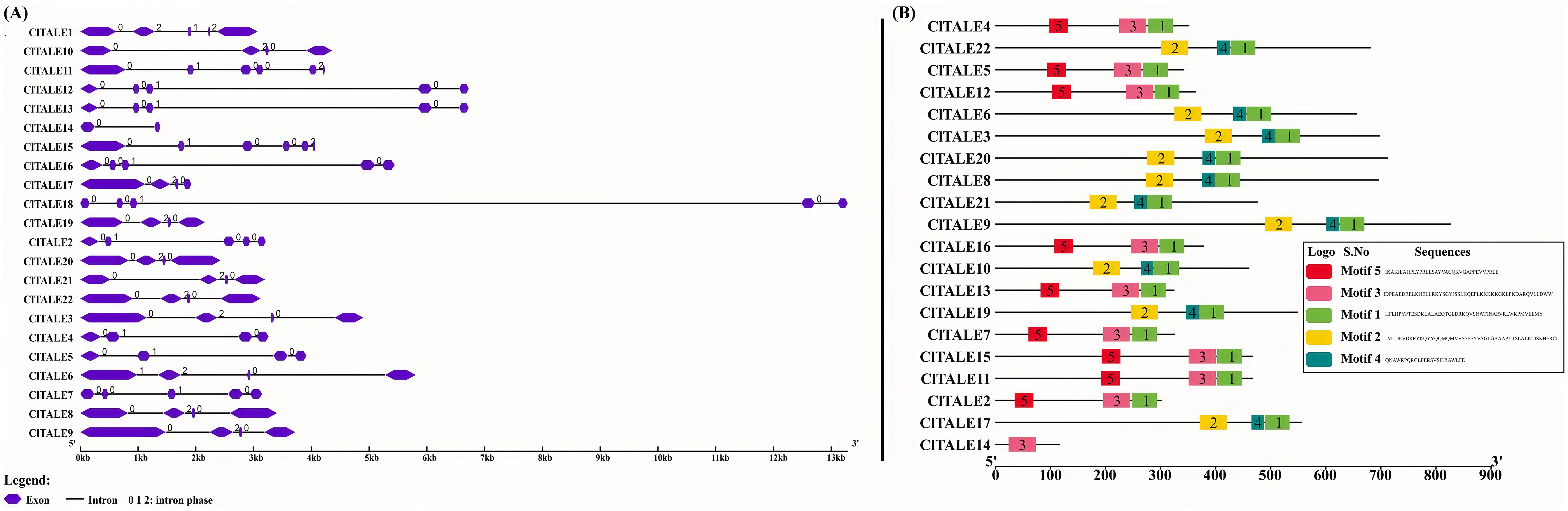 Gene structure analysis provides key insights into evolutionary relationships. Using genomic and coding sequence (CDS) data, we mapped the structure of the ClTALE genes. The analysis revealed diverse architectures, with most genes containing between 4 and 5 exons and 2 to 3 introns (Figure 3A). This variation in intron-exon organization reflects the structural divergence within the gene family.