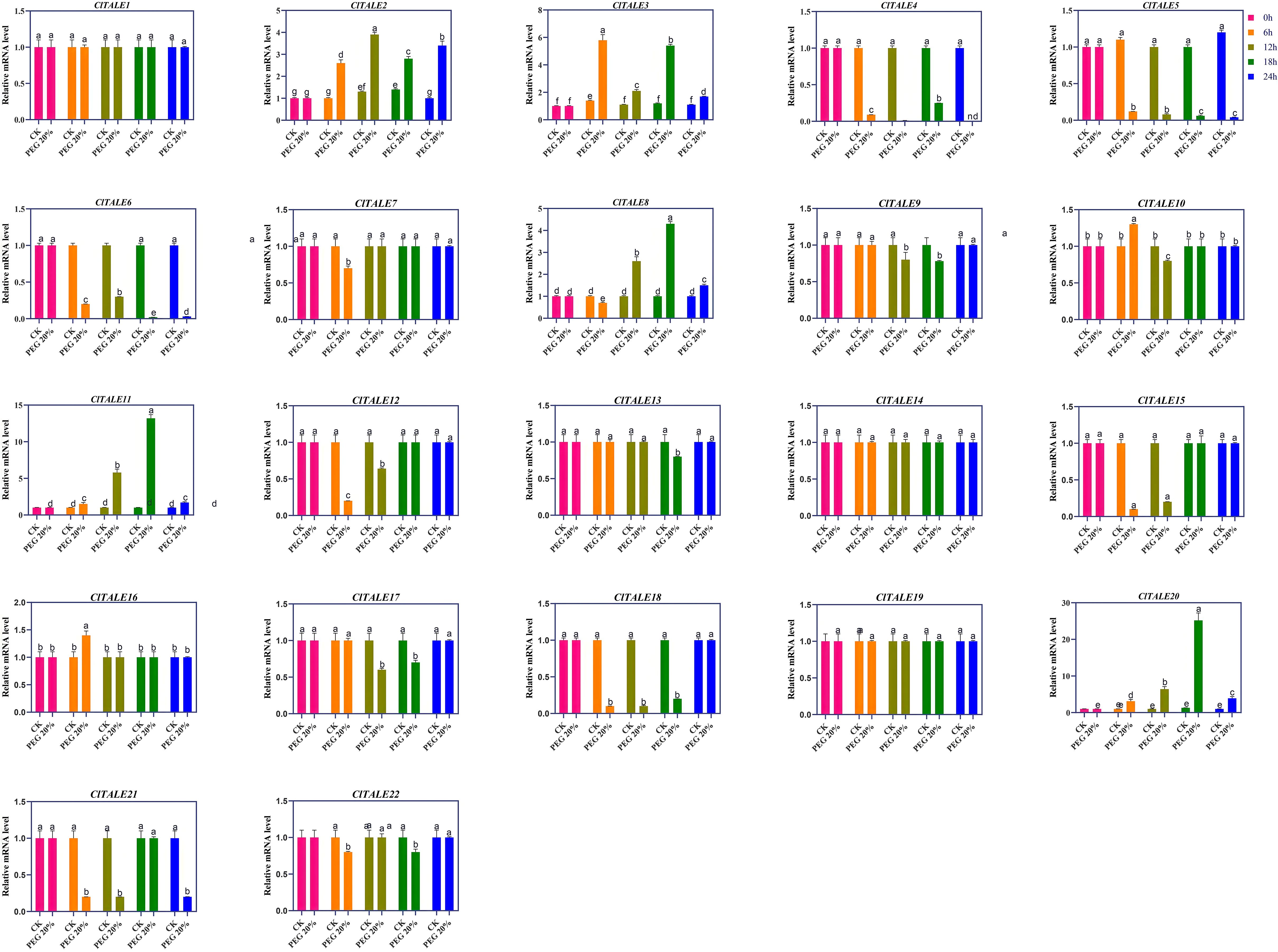 Figure 7. Expression profiles of selected ClTALE genes under drought stress (simulated by PEG treatment). Expression levels were analyzed at 0, 6, 12, 18, and 24 hours post-treatment.The CK represents the normal plants without PEG treatment. The Data are shown as mean ± SEM (n = 4). Different lowercase letters above the bars indicate statistically significant differences (p < 0.05) as determined by one-way ANOVA followed by Tukey’s HSD test.