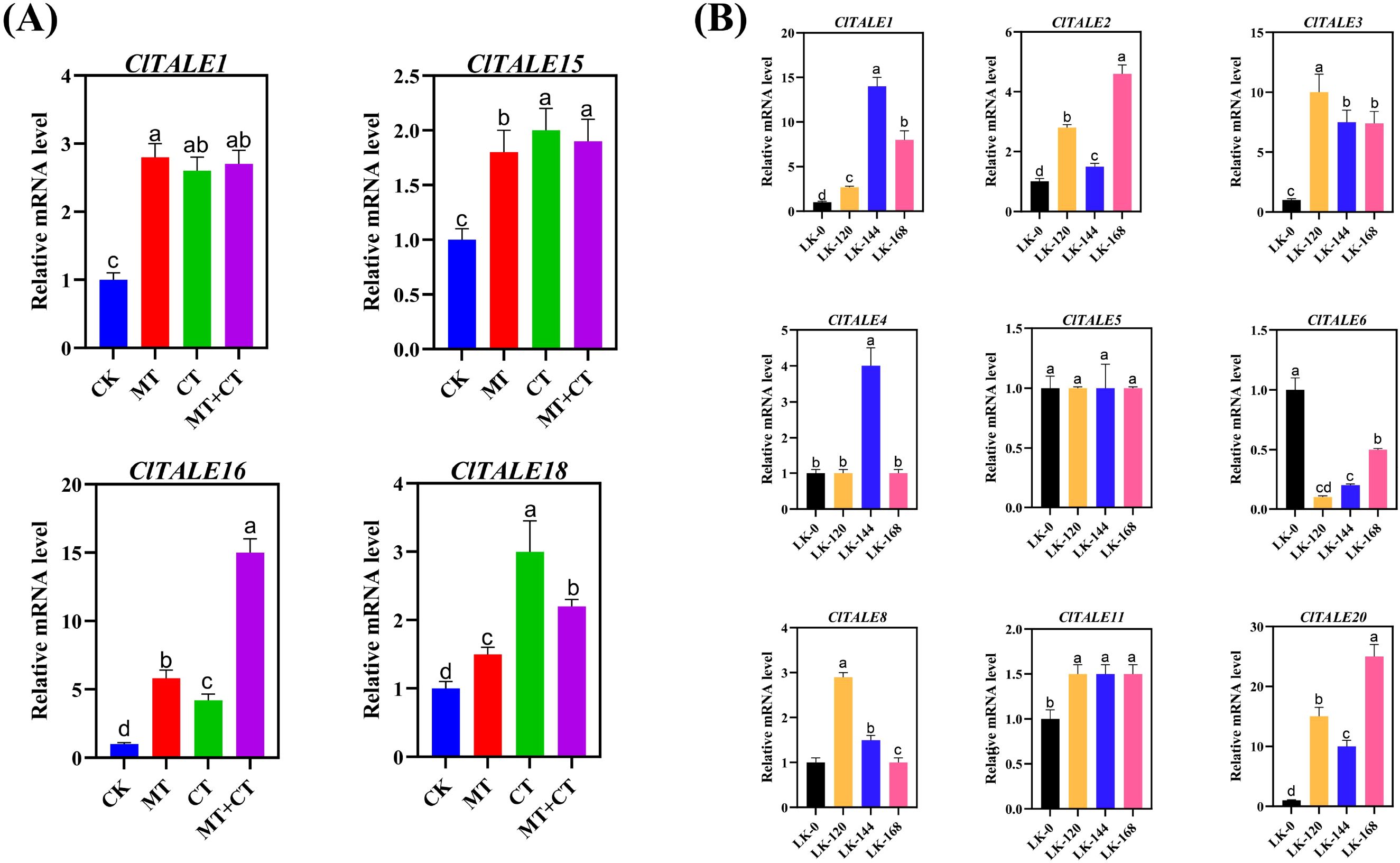 Figure 8. (A) Expression analysis of ClTALE genes under abiotic stress. (A) Heatmap of ClTALE gene expression profiles in response to co-treatment with melatonin (MT) and cold (CT). The heatmap was generated by hierarchical clustering of log2-transformed FPKM values using TBtools. red indicates high relative expression; blue indicates low relative expression. (B) Time-course qRT-PCR analysis of selected ClTALE genes under low-potassium (LK) stress. Samples were collected at 0, 120, 144, and 168 hours after treatment initiation. Gene expression levels were normalized to the internal reference gene and are presented relative to the 0-hour control using the 2^–ΔΔCT method. Data are shown as mean ± SD from four biological replicates. Different lowercase letters above the bars indicate statistically significant differences (p < 0.05) as determined by one-way ANOVA followed by Tukey’s HSD test.