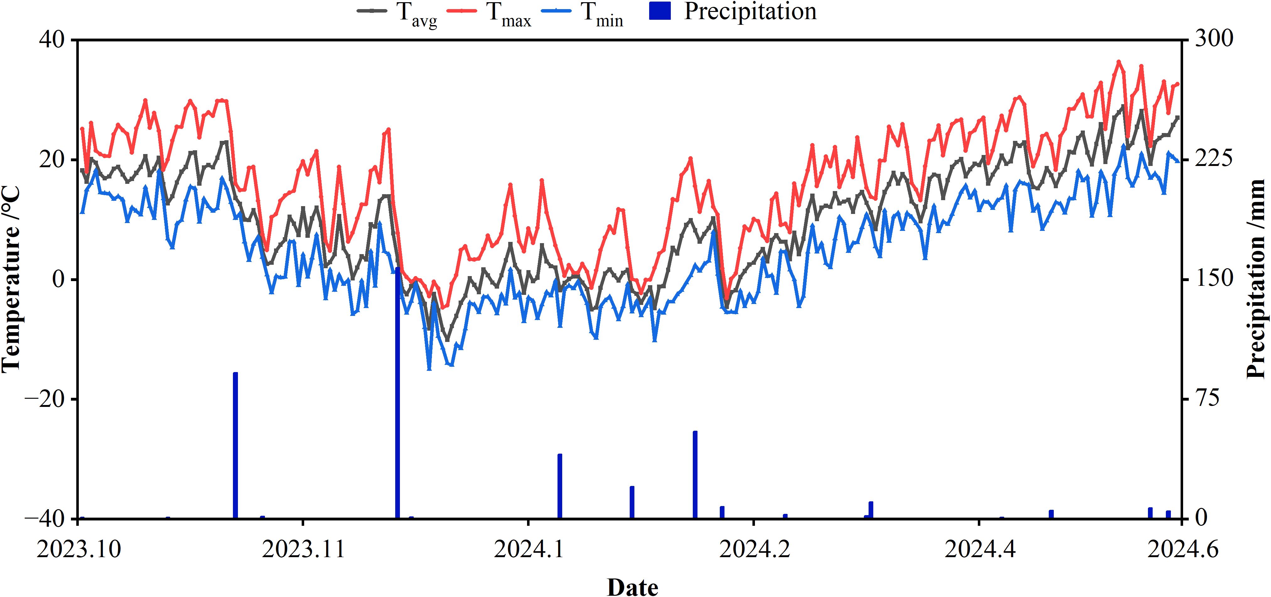 From October 2023 to June 2024, a field experiment was conducted at the Yuanyang Science and Education Park of Henan Agricultural University (35°11′N, 113°95′E), testing the effects of different fermentation methods of organic fertilizer combined with chemical fertilizer on winter wheat. Detailed temperature and precipitation trends during the experiment are shown in Figure 1. The test soil was sandy fluvo-aquic soil, with the 0–20 cm topsoil layer having the following baseline properties: pH 8.08, bulk density 1.36 g·cm-³, organic matter 16.17 g·kg-¹, total nitrogen (TN) 0.92 g·kg-¹, available phosphorus (AP) 18.41 mg·kg-¹, and available potassium (AK) 112 mg·kg-¹.