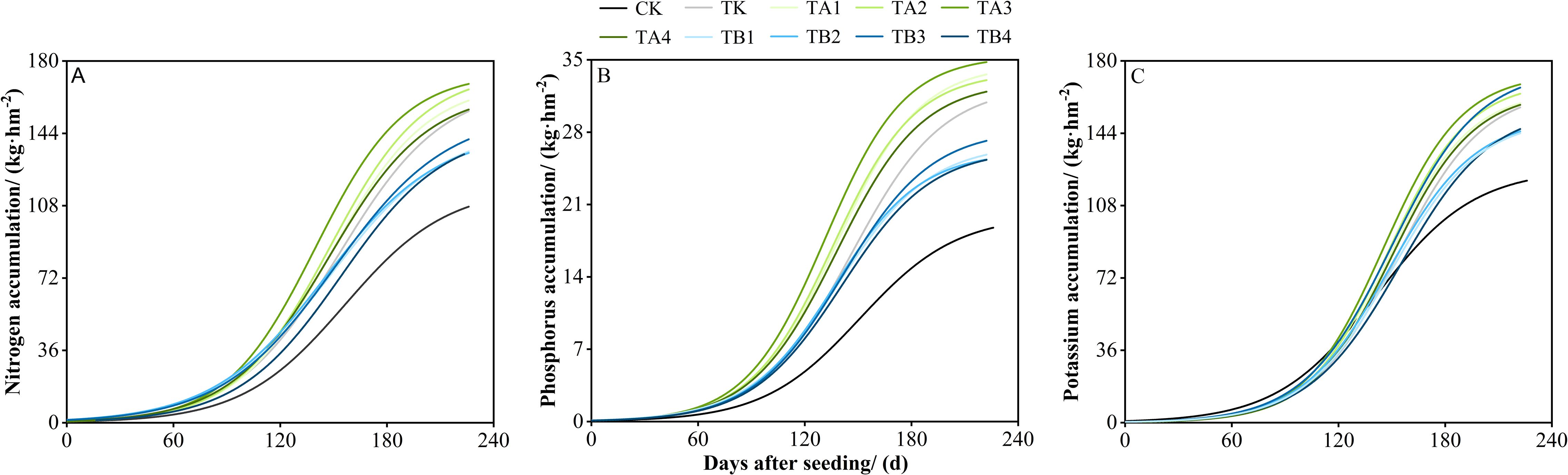 Across all treatments, N, P, and K accumulation in the above-ground parts of winter wheat followed an S-shaped curve over the growing season, characterized by an initial slow increase, a subsequent rapid accumulation phase, and a final plateau (Figure 2). Model fitting (Equations 1–7) results (Supplementary Table S1) showed that compared to TK, all treatments with 25% pig manure compost and 75% chemical fertilizer (TA1–TA4) increased the maximum above-ground accumulation (Ym) of N, P, and K by 1.40–6.57, 0.37–2.88, and 3.86–7.60 kg·hm-², respectively. The TA3 treatment performed best, with Ym values of 173.98, 35.38, and 173.60 kg·hm-², representing increases of 3.50%, 8.85%, and 4.58% over TK. TA2 ranked second, with respective increases of 3.90%, 4.03%, and 2.33%. In contrast, treatments with 50% organic fertilizer and 50% chemical fertilizer (TB1–TB4) significantly reduced above-ground N, P, and K accumulation, with reductions of 15.24–24.62, 6.25–6.40, and 9.38–14.35 kg·hm-², respectively. Furthermore, treatments TA1–TA4 advanced the onset of rapid nutrient accumulation (t1) by 1.0–7.6 days for N, 5.4–10.5 days for P, and 1.5–5.0 days for K, with TA3 showing the earliest onset. These treatments also shortened the duration of rapid accumulation (Δt) by 4.15–11.64 days (N), 4.59–9.60 days (P), and 3.46–5.78 days (K). Compared to TK, TA1–TA4 also enhanced average accumulation rates (Vmean) for N, P, and K by 12.71%, 16.43%, and 9.11%, respectively. In summary, TA3 was the most effective treatment, characterized by the highest Ym, the greatest average accumulation rate (Vmean), and the shortest duration of rapid accumulation (Δt).