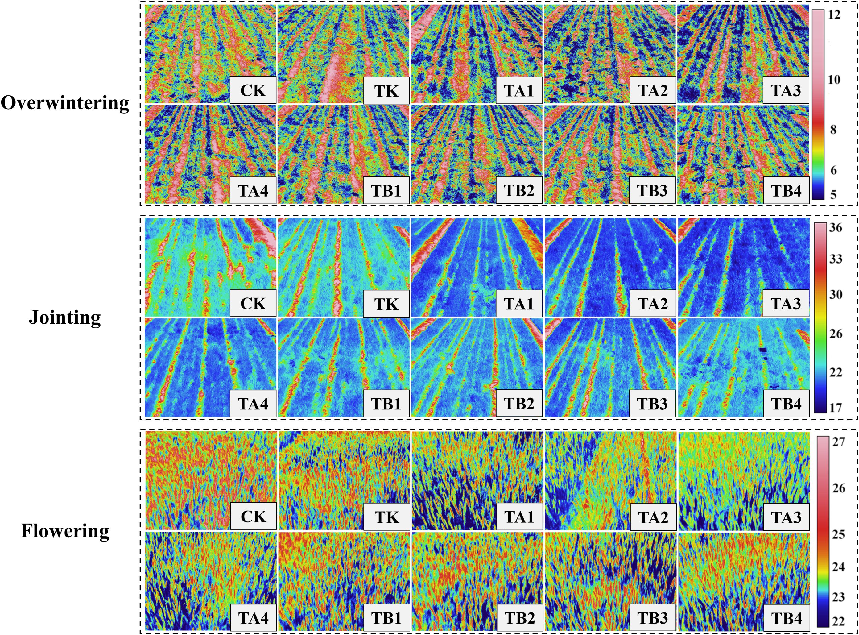 At the overwintering, jointing, and flowering stage, canopy temperature was measured between 11:00 and 13:00 on sunny days with minimal wind using an infrared thermal imager (TiX650, Fluke, USA). The imager’s camera lens was positioned approximately 1.0 m above the canopy with a 60° viewing angle. Three images were captured per plot, and canopy temperature were analyzed using the instrument’s SmartView software.