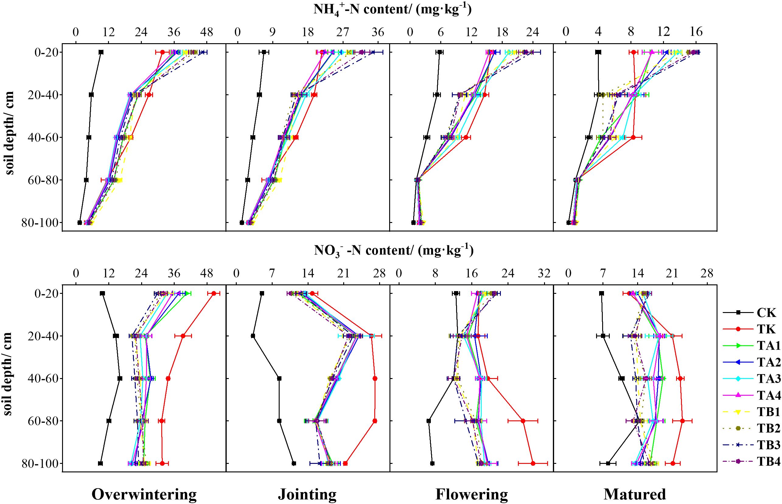 The spatial distribution of soil NH4+-N and NO3--N in the 0–100 cm profile was significantly affected by the combined application of pig manure compost and chemical fertilizer under different fermentation methods (Figure 4). TK treatment markedly increased NH4+-N and NO3--N levels across all soil layers. In contrast, treatments TA1–TB4 enhanced NH4+-N concentrations primarily in the 0–20 cm layer while reducing NO3--N accumulation in deeper layers (40–100 cm). During the overwintering stage, treatments TK–TB4 significantly increased NH4+-N in the 0–80 cm layer and NO3--N in the 0–100 cm layer, both decreasing with soil depth. The most notable declines in NH4+-N and NO3--N occurred between the 0–20 cm and 20–40 cm layers. At the jointing stage, NH4+-N maintained a depth-dependent decline similar to that observed during overwintering, whereas NO3--N first increased and then decreased with depth. NO3--N peaked at 60–80 cm (23.00 mg·kg-¹) in the TK group but peaked at 20–40 cm (12.88–18.00 mg·kg-¹) in the TA1–TB4 groups. During flowering, NH4+-N levels declined rapidly from 0–80 cm, with TA1–TB4 maintaining high concentrations in the top 0–20 cm layer (15.49–23.89 mg·kg-¹). At maturity, NH4+-N levels followed a pattern similar to that observed at flowering. In the 0–20 cm layer, NH4+-N concentrations under TA1–TB4 were 26.20%–94.40% higher than under TK. NO3--N content under TK and TA1–TA4 initially increased with depth and then declined, with TK showing the highest NO3--N accumulation in the 20–100 cm layer. In contrast, TB1–TB4 treatments showed an inverse trend—NO3--N increased in the 0–20 cm layer by 7.84%–21.61% over TK, dropped to the lowest levels at 40–60 cm (12.03–13.00 mg·kg-¹), and then rose again in deeper layers.