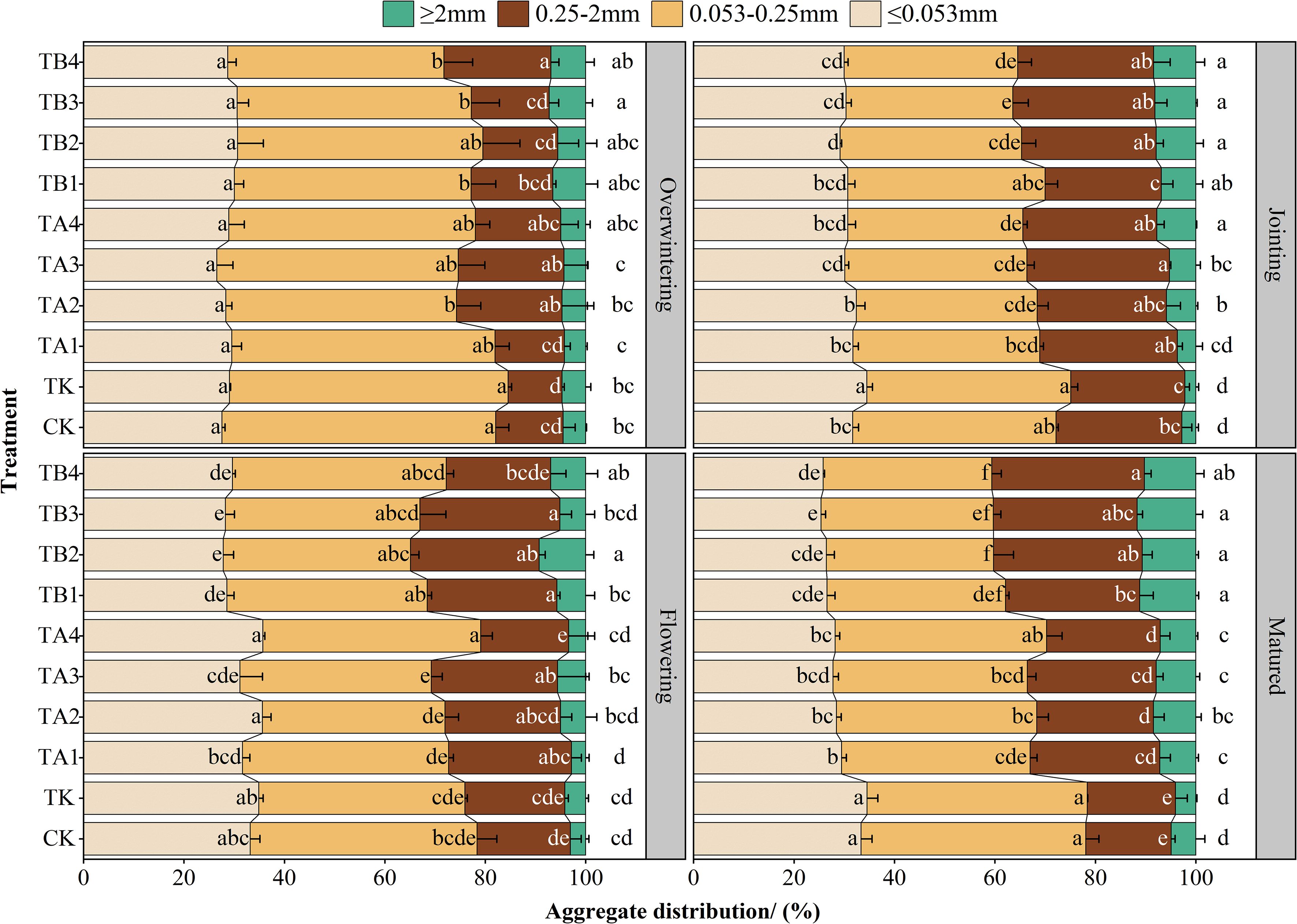 Figure 5. Effects of different fermentation methods of pig manure compost combined with chemical fertilizer on soil aggregate distribution of winter wheat. The different lowercase letters in the figure indicate significant differences between the treatments (P < 0.05), the same below.