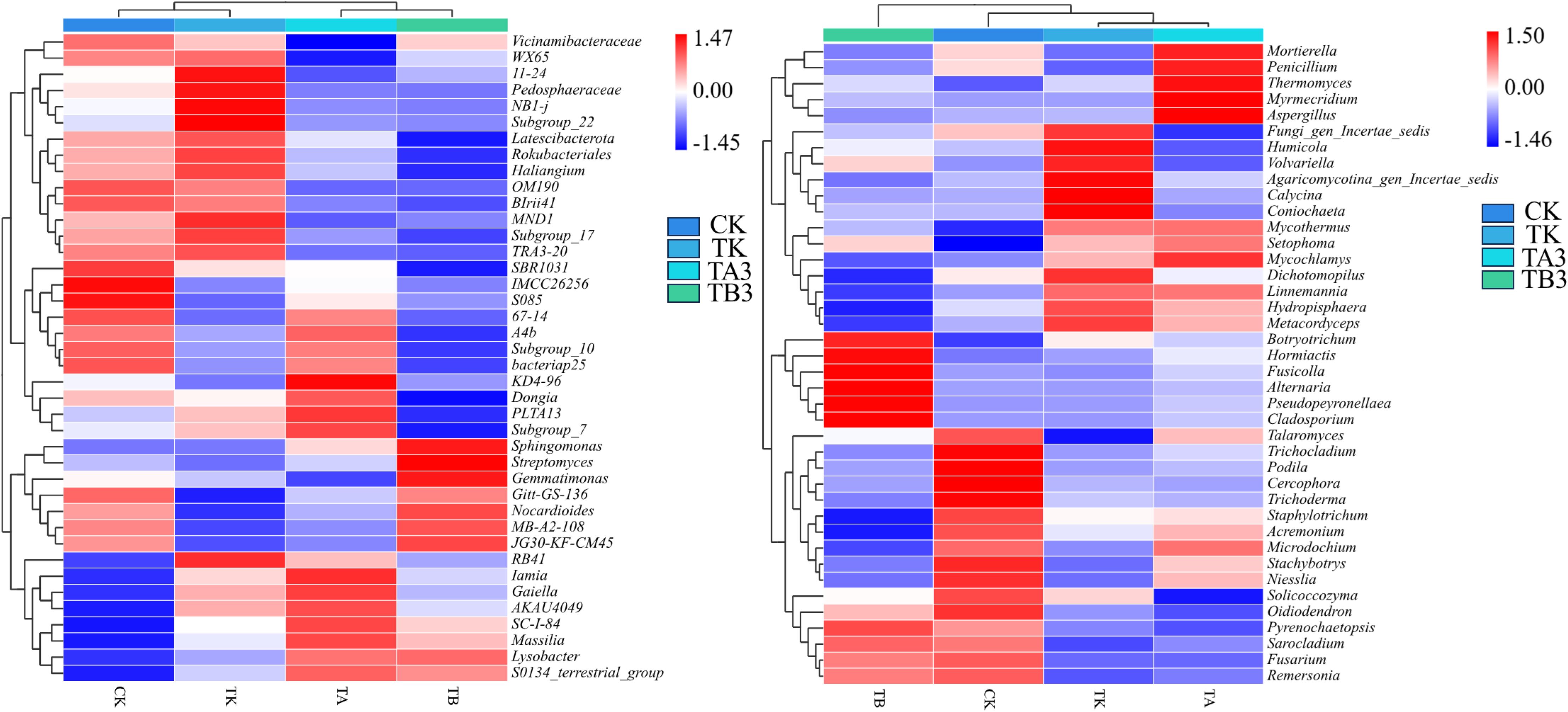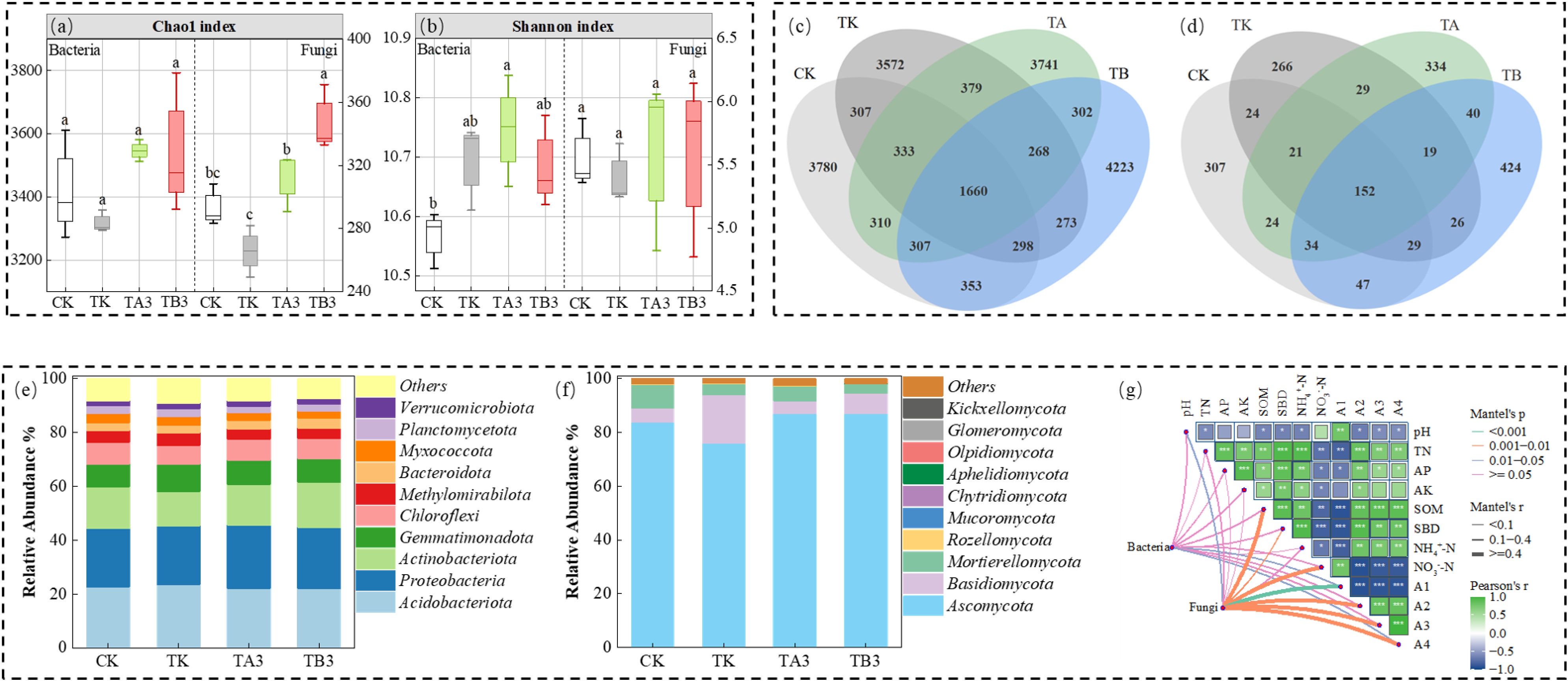 At the phylum level, a total of 33 bacterial phyla were detected across the four treatments (Figure 6e). The top ten phyla by relative abundance included Acidobacteriota, Proteobacteria, Actinobacteriota, Gemmatimonadota, Chloroflexi, Methylomirabilota, Bacteroidota, Myxococcota, Planctomycetota, and Verrucomicrobiota. Different treatments showed varying bacterial abundance. Compared to TK, the relative abundance of Acidobacteriota and Bacteroidota in TA3 and TB3 treatment groups increased by 0.17% and 1.07%, and 1.24% and 0.11%, respectively. For fungi (Figure 6f), 10 phyla were detected, with Ascomycota, Basidiomycota, and Mortierellomycota accounting for over 95% of the total abundance. Ascomycota dominated the fungal communities in TA3 and TB3, with relative abundances of 81.35% and 81.43%, slightly lower than those in TK by 1.35% and 1.27%. In contrast, Basidiomycota abundance increased by 0.26% and 2.40%, respectively.