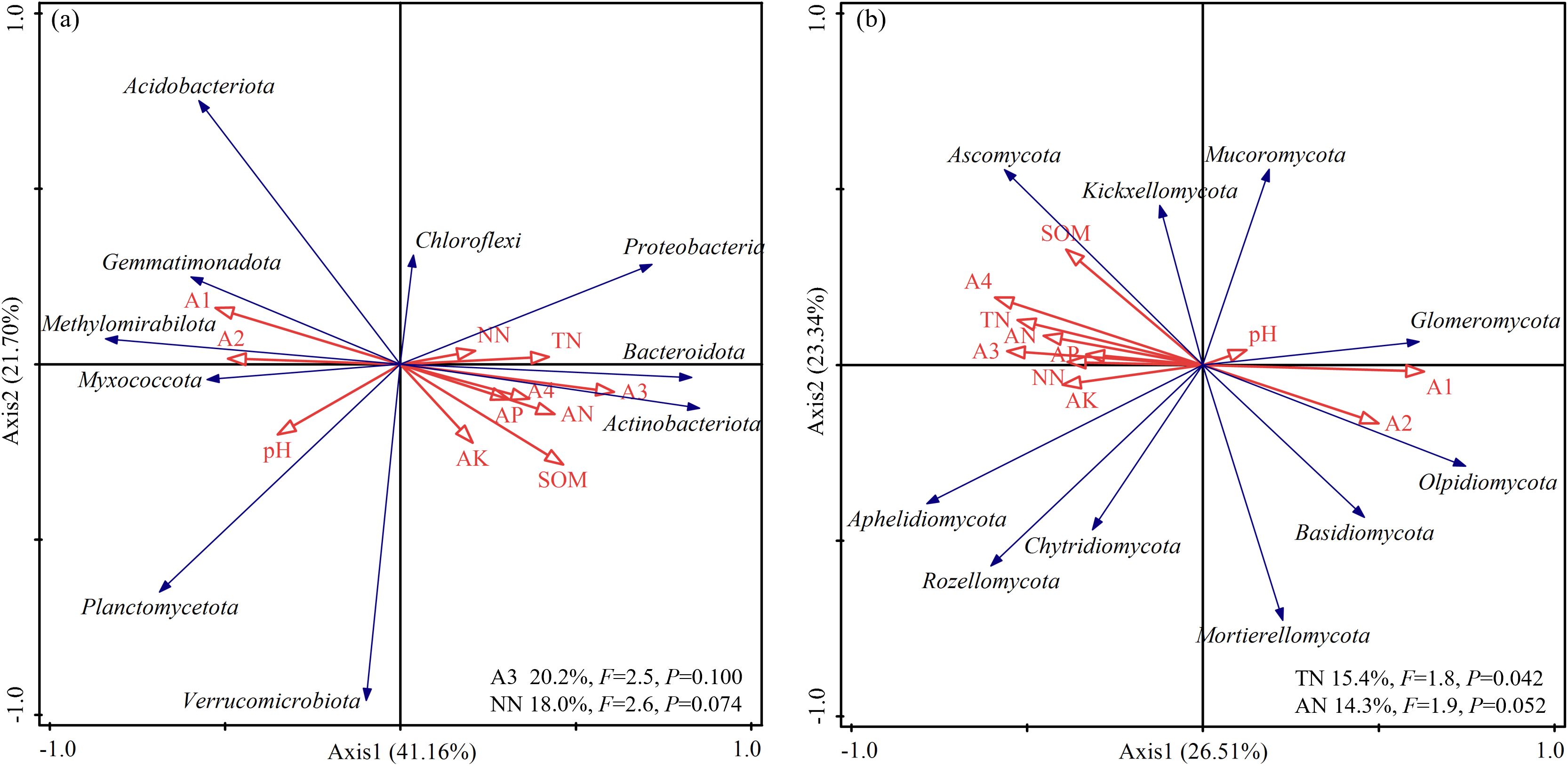 Figure 7. Redundancy analysis (RDA) of Bacteria (a) and Fungi (b) with Soil Properties. In the figure, AN-mmonium nitrogen, NN-nitrate nitrogen, A4-large aggregates (≥2mm), A3-large aggregates (0.25-2mm), A2-microaggregates (0.053-0.25mm) and A1-powder clay (≤0.053mm).