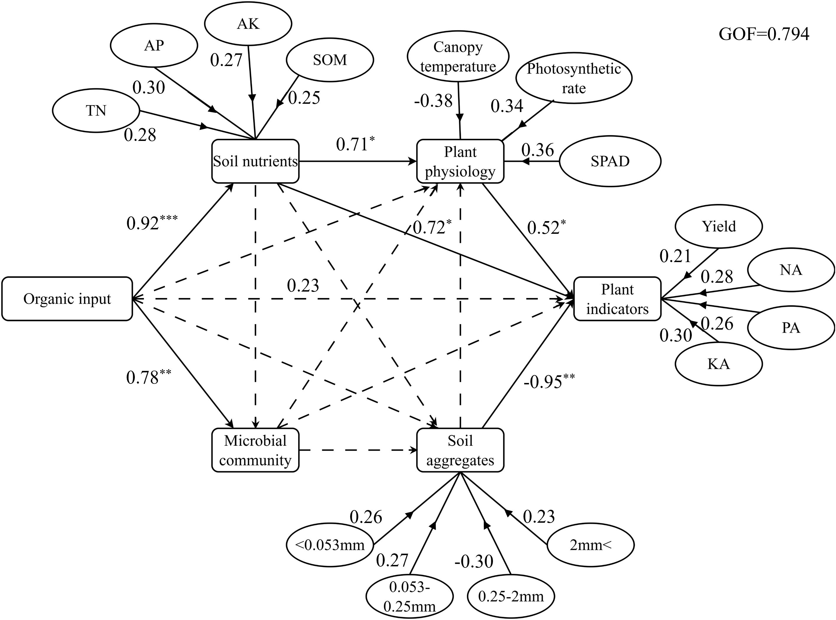 Figure 9. Partial least squares path analysis model. The TN, AP, AK and SOM is soil total nitrogen, available phosphorus, available potassium and organic matter. < 0.053mm, 0.053-0.25mm, 0.25-2mm and 2mm < is aggregate size distribution. NA, PA and KA is the accumulation of nitrogen, phosphorus and potassium.