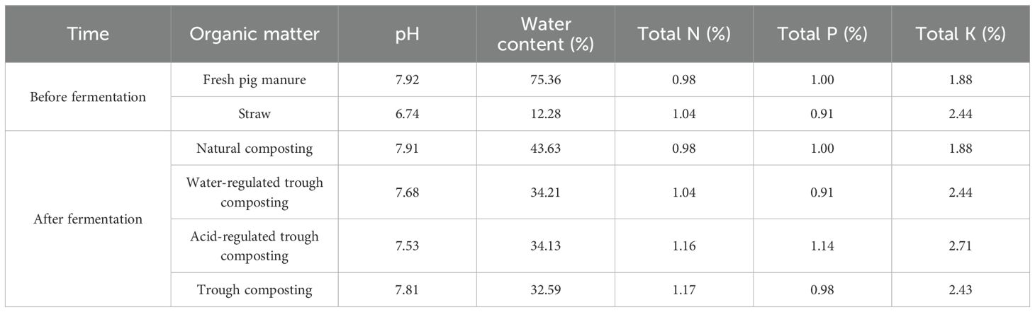 The organic fertilizers used in this study were prepared by fermenting fresh pig manure (after solid-liquid separation) with wheat straw for 32 days. Four fermentation methods were applied. The first was natural composting, in which the pig manure and straw were stacked in windrows measuring 10 m in length, 2.5 m in width, and 1.2 m in height for passive fermentation. The remaining three methods involved trough composting, conducted in a trough structure measuring 40 m in length (divided into three 10 m sections with 5 m buffer zones), 20 m in width, and 2.5 m in height. The compost was turned every 24 hours using mechanical equipment. The three trough composting treatments were as follows: (1) Conventional trough composting, where no additional treatment was applied before or after turning; (2) Water-Regulated trough composting method: After each turning, spray water onto the compost surface using a sprayer at a rate of 2 kg per square meter. (3) Acid-regulated trough composting method: After each turning, spray a 0.005 mol·L-¹ dilute acetic acid solution onto the compost surface at a rate of 2 kg per square meter. The physicochemical properties of the organic fertilizers before and after fermentation are shown in Table 1.
