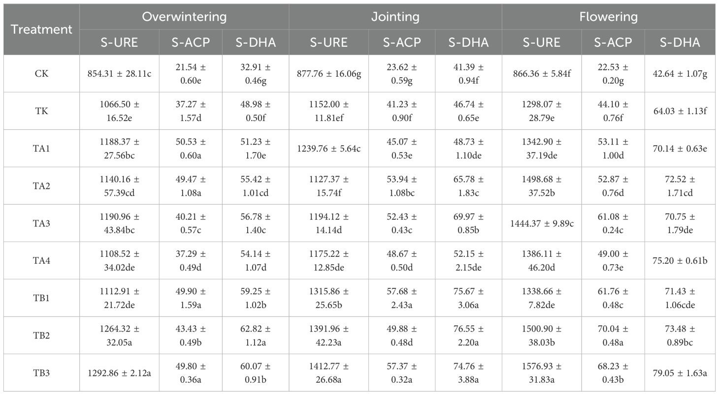 Soil enzyme activities increased progressively throughout the winter wheat growth stage and were significantly affected by fertilization (Table 3). The CK group exhibited the lowest activities of soil urease (S-URE), acid phosphatase (S-ACP), and dehydrogenase (S-DHA), with reductions of 34.04%, 81.11%, and 37.29%, respectively, compared to TK. Co-application of pig manure compost and chemical fertilizer significantly enhanced soil enzyme activity, with the TB1–TB4 treatments (50% organic fertilizer) showing the most pronounced effects. Compared to TK, TB1–TB4 S-URE activity by 15.82%, 20.74%, and 14.80%, S-ACP activity by 29.01%, 33.33%, and 55.36%, and S-DHA activity by 25.59%, 66.84%, and 14.50% during the overwintering, jointing, and flowering stage, respectively. Relative to the TA1–TA4 treatments (25% organic fertilizer), TB1–TB4 further improved soil enzyme activities (S-URE, S-ACP, and S-DHA) by 8.37%, 12.20%, and 15.12% on average during the overwintering, jointing, and flowering stage, respectively. Consistent with enzyme activity trends, soil nutrient levels were also significantly affected by fertilization (Supplementary Figure S2). At maturity, TK increased TN, AP, and AK by 28.41%, 91.54%, and 9.54%, respectively, over the CK group, while soil organic matter (SOM) rose by 2.61% (P > 0.05). On average, TA1–TB4 treatments raised TN, AP, AK, and SOM by 43.44%, 173.57%, 24.65%, and 19.04%, respectively. Compared to TK, TA1–TA4 increased TN, AP, AK, and SOM by 9.48%, 57.40%, 19.06%, and 9.18%, while TB1–TB4 increased these values by 13.94%, 28.26%, 8.53%, and 22.83%, respectively. In terms of pH, TK lowered soil pH by 0.14 compared to CK, whereas TA1–TB4 treatments reduced it by only 0.05 on average. Compared to TK, TA1–TA4 and TB1–TB4 increased soil pH by 0.10 and 0.08, respectively.