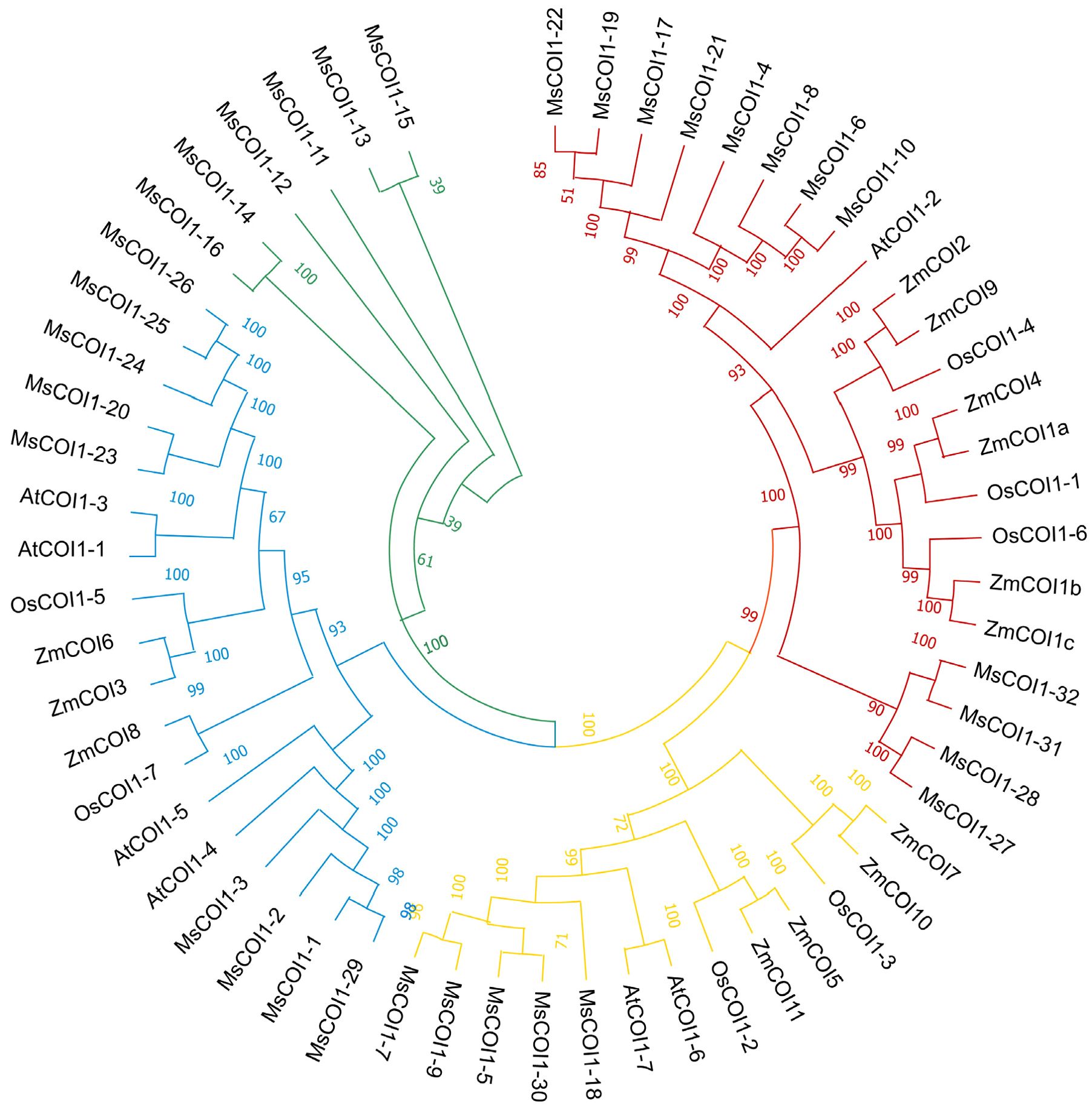 Figure 2. Phylogenetic tree of MsCOI1 proteins from alfalfa, maize, rice, and Arabidopsis. The phylogenetic tree was constructed using COI1 amino acid sequences by the neighbor-joining (NJ) method with 1,000 bootstrap replicates. The phylogenetic tree was divided into four groups shown in different colors. The bootstrap support values >75% were shown.