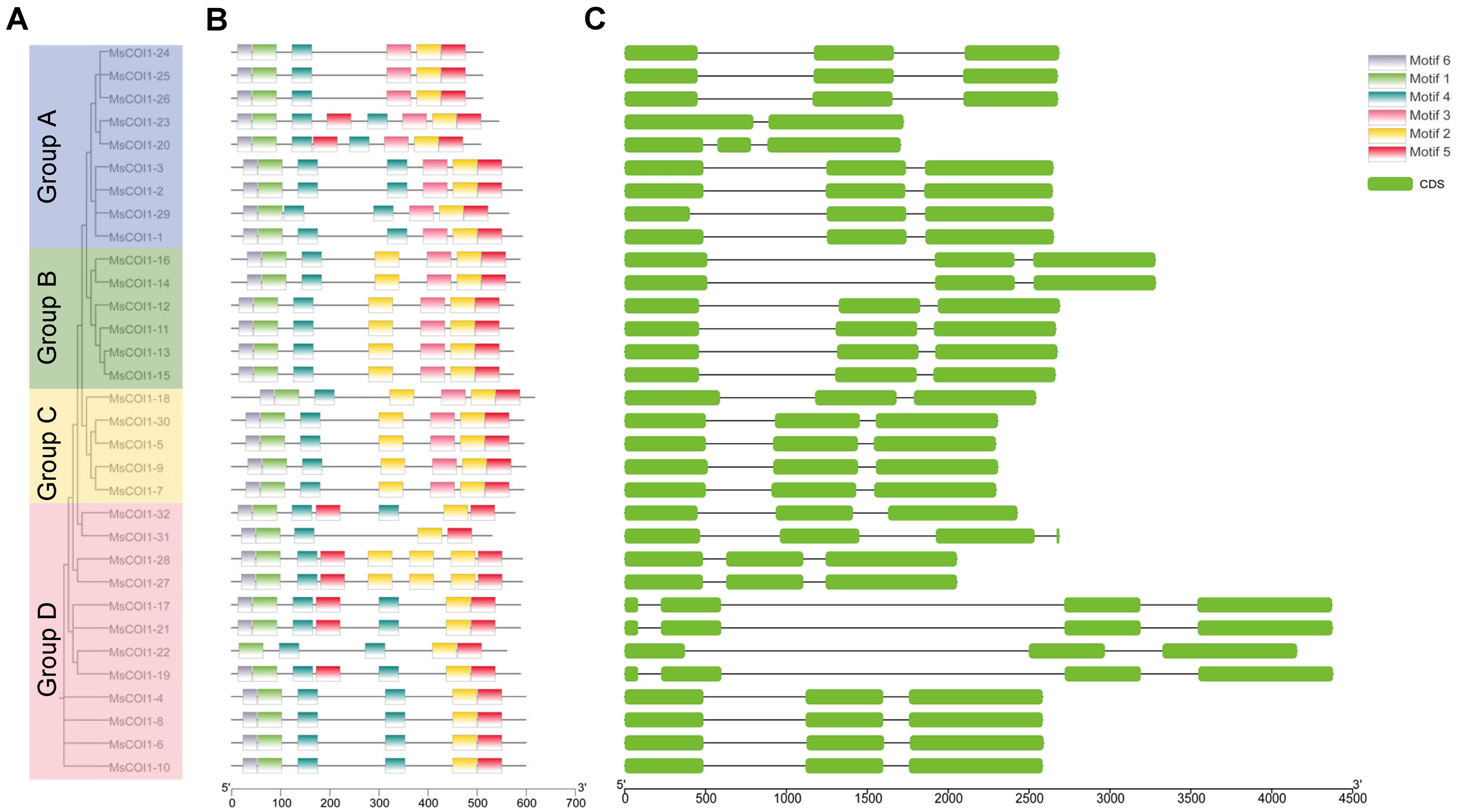Figure 3. Analysis of conserved motifs and gene structure in the MsCOI1 genes. (A) The phylogenetic tree of MsCOI1 protein in alfalfa. The phylogenetic tree of the COI1 amino acid sequence was constructed by using the neighbor-joining (NJ) method, and 1000 bootstrap repetitions were carried out; (B) Six types of conserved motifs were predicted in the MsCOI1 protein sequences. The different motifs were shown in different color boxes; (C) CDS regions and introns were shown as green boxes and horizontal lines, respectively.