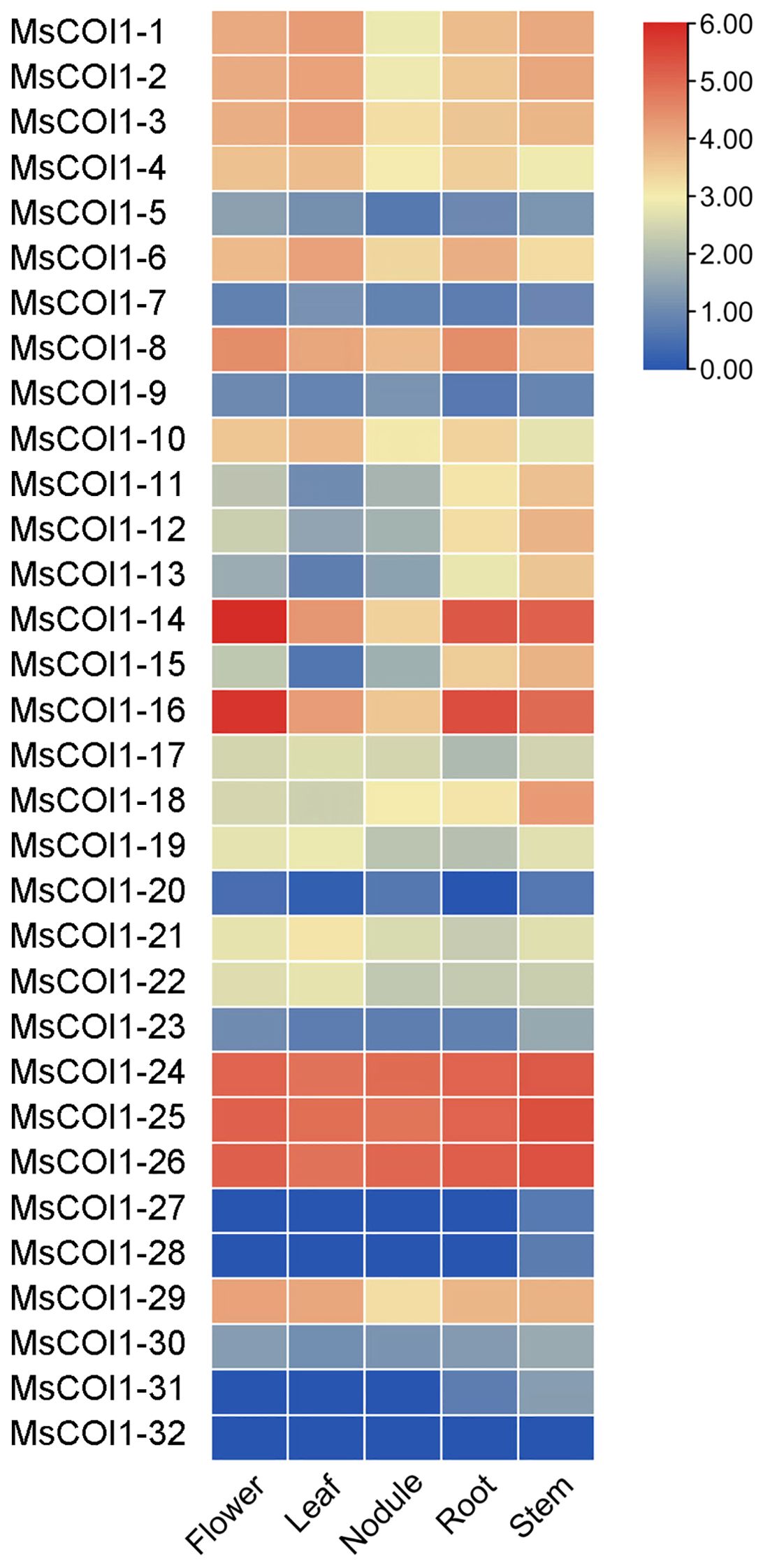 Figure 5. Expression levels of MsCOI1s in different tissues. Transcriptome data were used to analyze the samples of roots, nodule, stems, leaves, and flowers. The gene expression level was calculated based on the FPKM value. Red and blue represent high and low expression levels, respectively. The raw are provided in Supplementary Table 8.