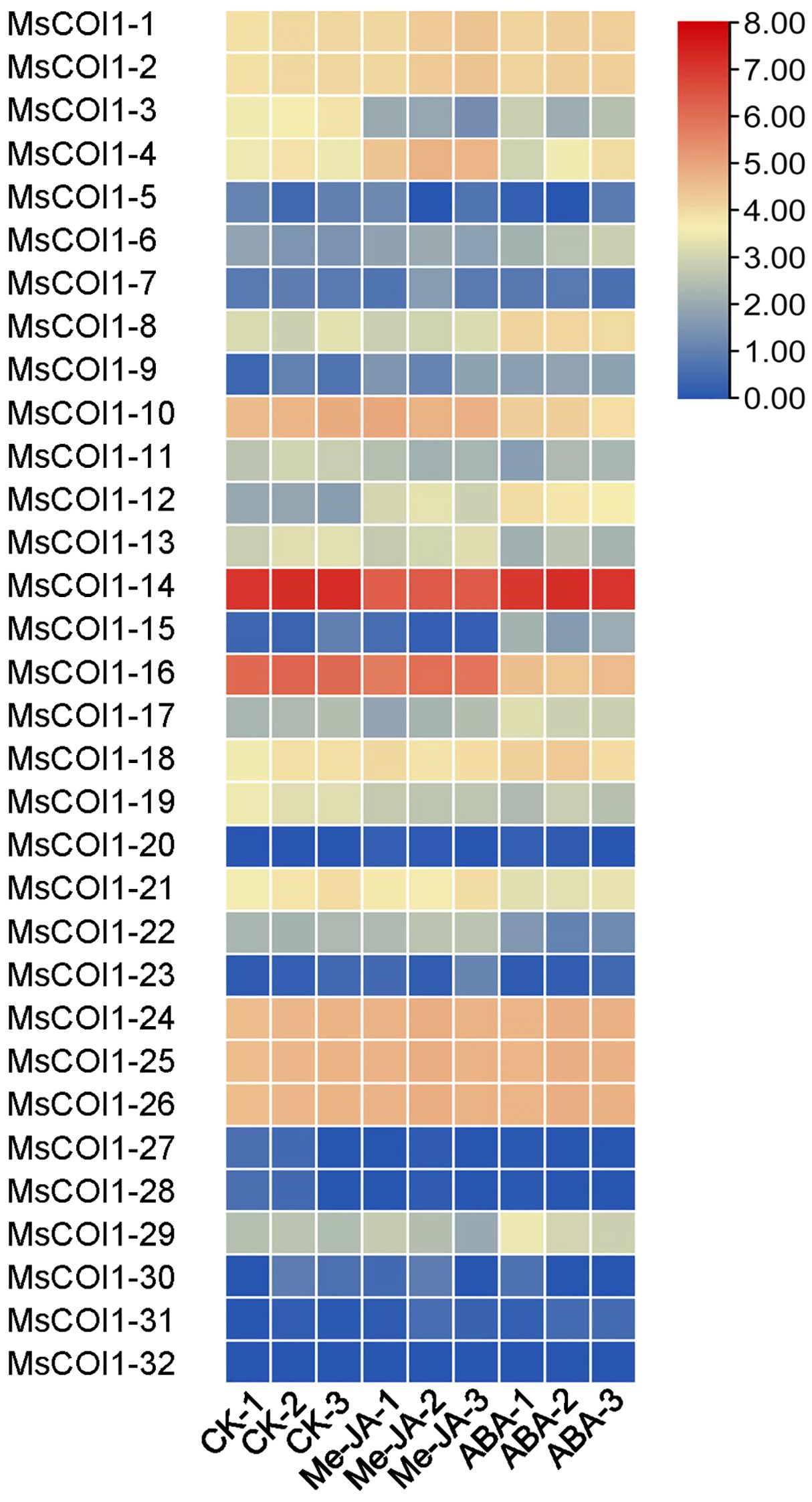 Figure 6. The expression profiles of 32 MsCOI1 genes under 100 mM exogenous methyl jasmonate (MeJA) and abscisic acid (ABA) spraying treatments. The data represented three independent biological replicates. Gene expression levels, quantified using FPKM values, were depicted with red and blue indicating high and low expression, respectively. Raw data were available in Supplementary Table 9.