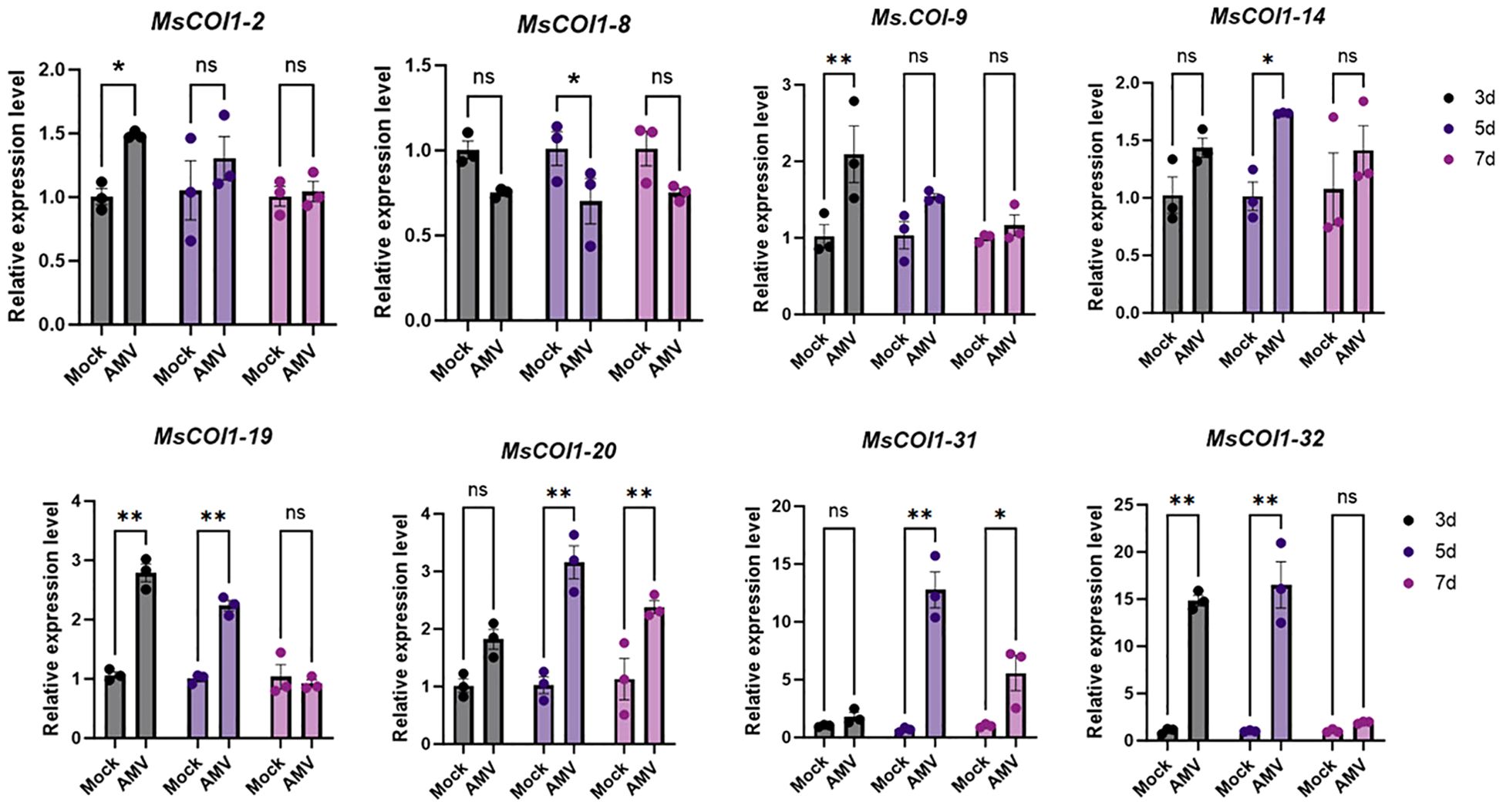 Figure 7. Expression analysis of eight MsCOI1s after AMV treatment. RT-qPCR analysis of the mRNA expression levels of MsCOI1s in the leaves of alfalfa plants at 3 dpi, 5 dpi, and 7 dpi after AMV treatment. The MsActin gene was used as the internal reference gene (Supplementary Table 7). Asterisks indicated significant differences [Student’s t-test, n=3, *p < 0.05, **p < 0.01; Error bars represent standard error (SE)]. “ns” indicates that there is no significant difference between the two sets of data.