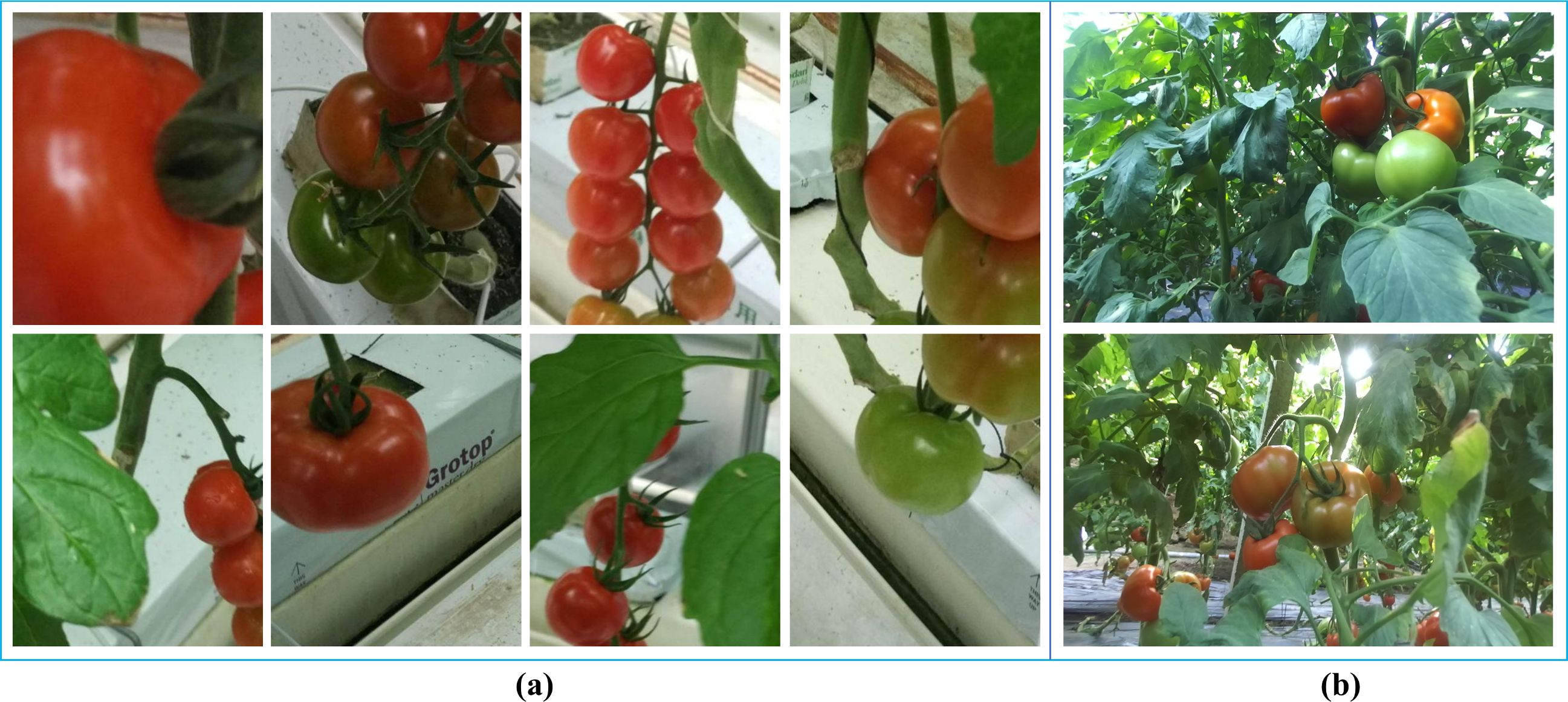 Figure 1. Partial tomato datasets. (a) Example images from the tomato dataset. (b) Tomato images captured by a ZED stereo camera.