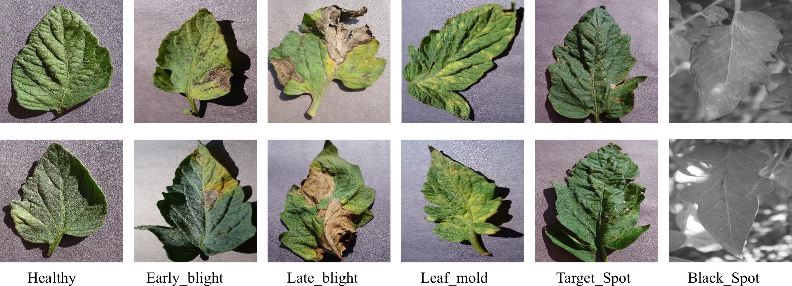 The foliar disease datasets used in this study was obtained from the Kaggle platform, comprising over 700 tomato leaf images collected from both laboratory and field environments. The dataset contains six disease categories and one healthy class, including common tomato pathogens: Bacterial spot, Early blight, Late blight, Leaf mold, Target Spot, and Black Spot. The data has been augmented of using multiple advanced techniques such as image flipping, Gamma correction, noise injection, PCA color augmentation, rotation, and scaling. Some foliar disease datasets are shown in Figure 2.