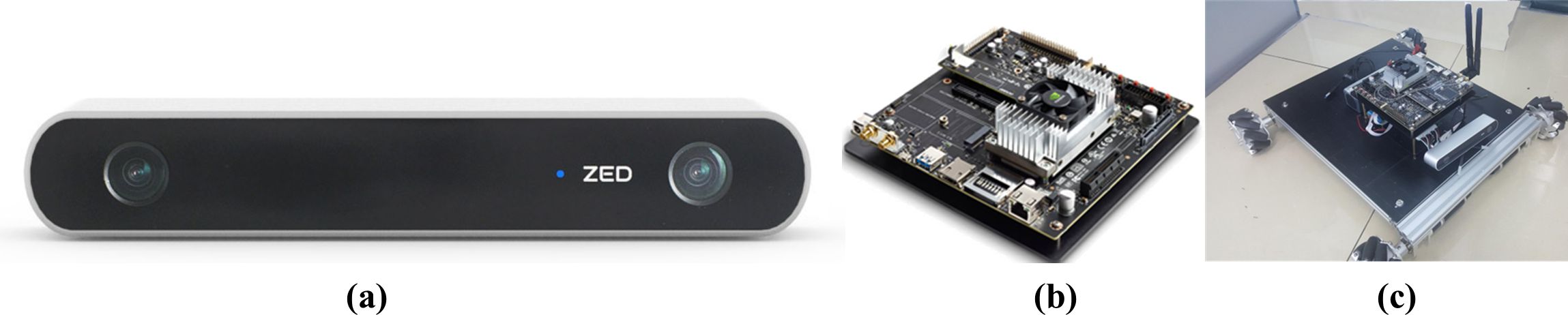 Figure 3. Hardware facilities for image acquisition and processing. (a) ZED binocular vision camera. (b) Jetson TX2 edge computing module. (c) McNam wheel omnidirectional mobile platform.