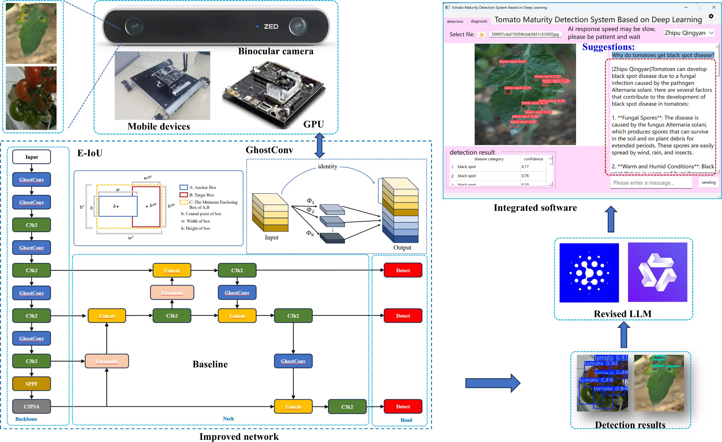 This study presents an intelligent tomato detection and management system based on the GAE-YOLO model, which achieves end-to-end process optimization—from fruit detection to disease diagnosis and ripeness assessment—through the integration of multiple advanced technologies. Methodologically, the system is built upon four core technical modules: (1) a lightweight GAE-YOLO object detection framework for high-precision identification of tomato fruits and disease symptoms; (2) a three-dimensional vision system integrated with a ZED depth camera to establish accurate spatial coordinate calculations for robotic harvesting; (3) a multi-scale feature fusion algorithm designed for tomato ripeness classification and yield estimation; and (4) visualization software that combines disease diagnosis with LLMs interaction, enabling a modular “detection-diagnosis-decision” closed-loop management system. The collaborative workflow of these modules is demonstrated in the technical roadmap (Figure 4).