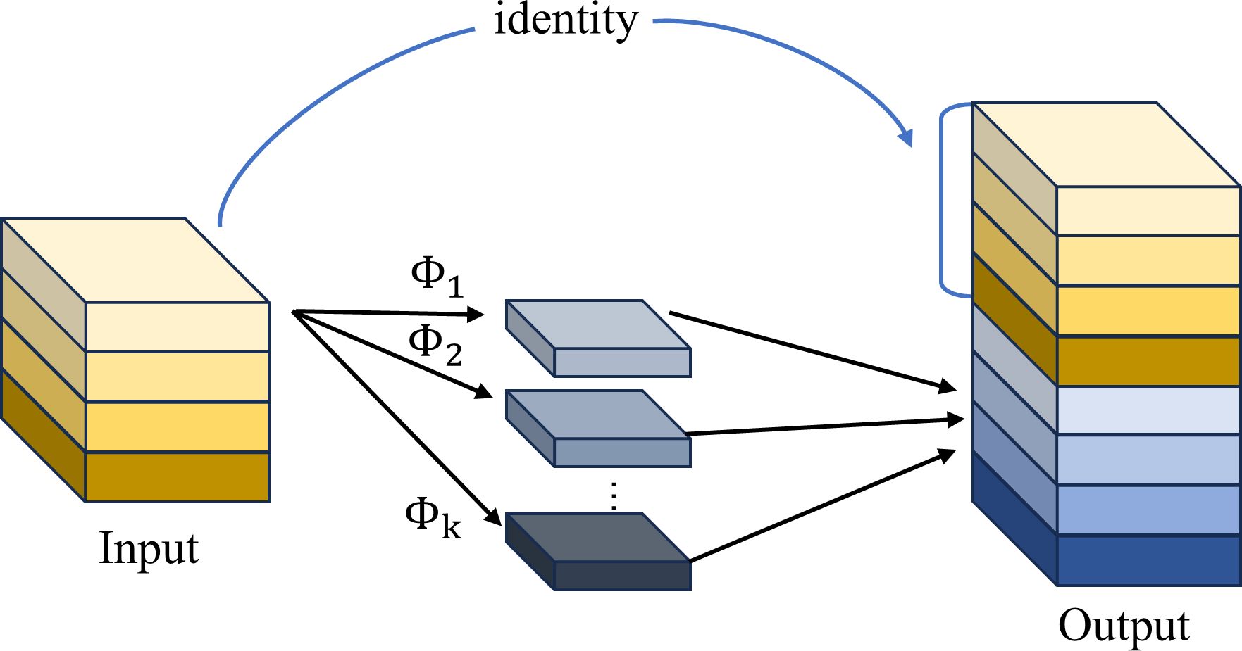 A linear transformation is then applied to the output intrinsic feature maps to generate ghost feature maps (Equations 2, 3).