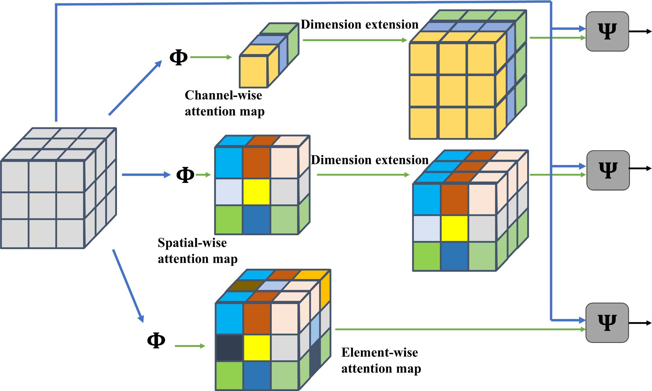 Figure 7 presents schematic diagrams of various attention mechanisms, including: Channel-wise Attention Mechanism, Spatial-wise Attention Mechanism, and Element-wise Attention Mechanism.