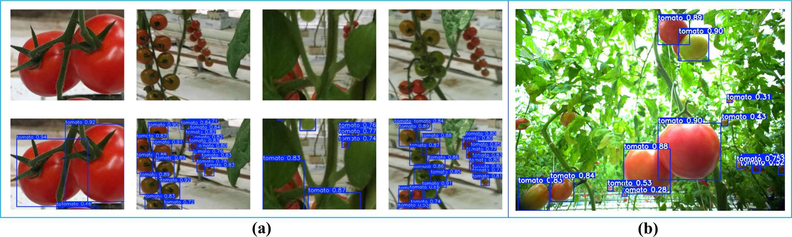 Figure 11. Visualization results of GAE-YOLO tomato detection. (a) Standardized test set. (b) Real greenhouse scenario.
