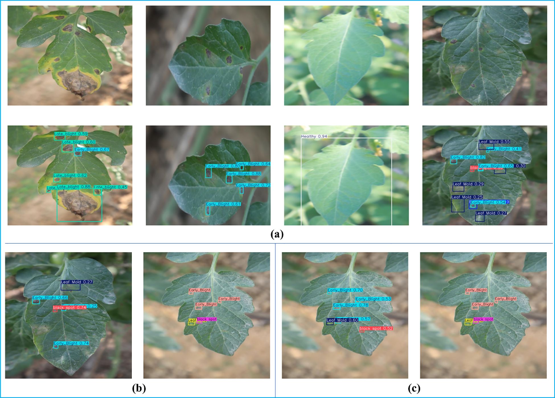 Figure 12. Visual detection results and error case analysis of tomato leaf diseases based on GAE-YOLO. (a) Successful detection cases under challenging conditions. (b, c) Representative error cases contrasting model predictions (left) with ground-truth annotations (right).