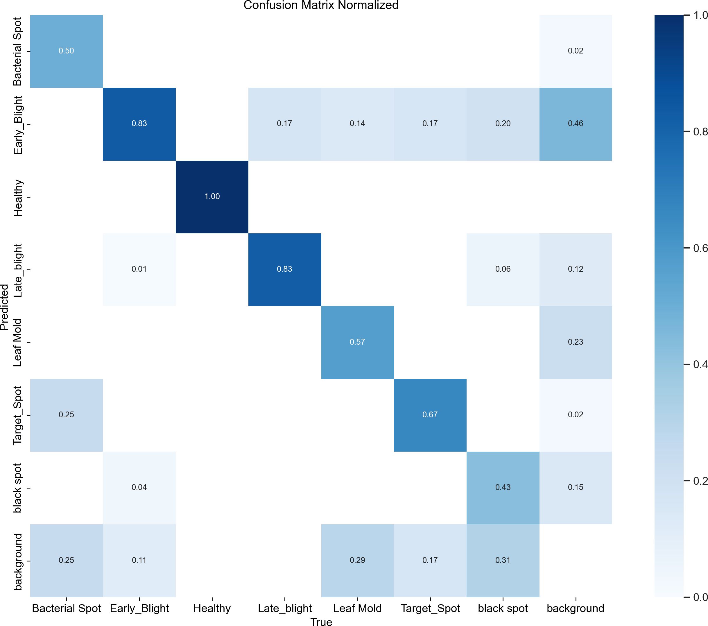 Figure 13 presents the classification performance of the model for tomato leaf disease detection through a normalized confusion matrix. The matrix reveals that healthy leaves are identified with the highest accuracy (main diagonal value: 0.99). However, disease category recognition, particularly for early blight demonstrates significant challenges, with only 46% correct identification and 83% misclassification as healthy leaves. Other disease categories (e.g., leaf mold and black spot) exhibit varying confusion levels, primarily due to visual similarity in early-stage symptoms. These results highlight the model’s current limitations in detecting subtle disease features, providing critical insights for subsequent optimization of early disease identification capabilities. The observed performance gap, particularly for minority classes such as black spot and leaf mold, is primarily attributed to class imbalance within the dataset. To mitigate this issue and the associated risk of overfitting, several targeted strategies can be implemented during training: (1) a class-weighted loss function can be employed to increase the penalty for misclassifying minority classes, thereby directing greater attention to them; (2) specialized data augmentation techniques—such as PCA color augmentation, random rotation, and noise injection—can be preferentially applied to these under-represented classes to increase their effective sample size and feature diversity.