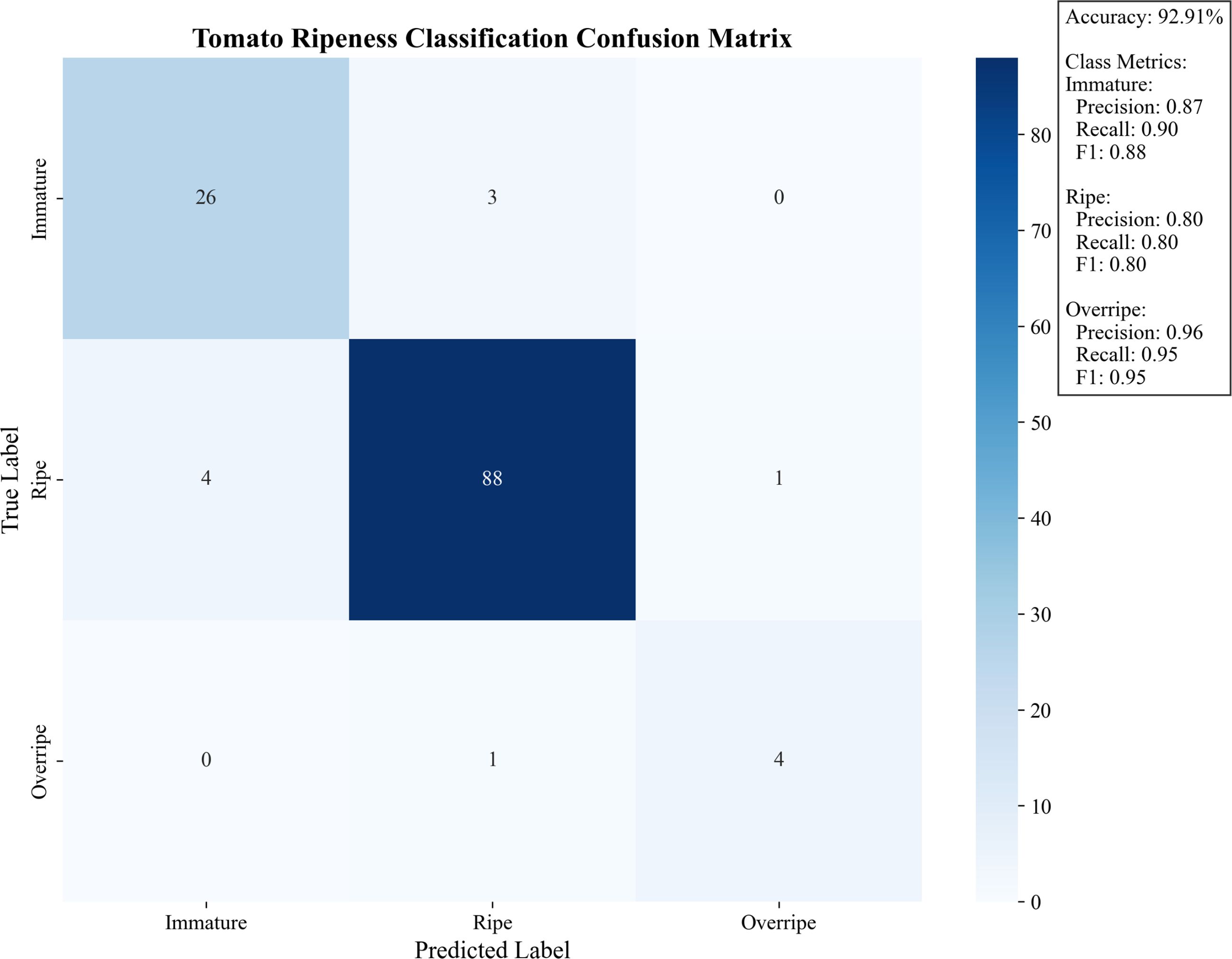 Figure 14 presents the tomato maturity classification confusion matrix, demonstrating the model’s performance in maturity discrimination by visualizing the correspondence between predicted labels (immature, mature, overripe) and ground truth labels. The model achieves an overall accuracy of 92.91%, with particularly strong performance in overripe category identification (F1-score: 0.95) and relatively weaker performance in mature category discrimination (F1-score: 0.80). Detailed error analysis reveals that among 88 immature samples, 1 was misclassified as mature, while mature samples showed 4 misclassifications as immature and 1 as overripe, with only 1 overripe sample misclassified as mature. This error distribution indicates persistent challenges in distinguishing adjacent maturity stages (particularly immature-to-mature transitions), with most misclassifications occurring during color transition phases, though the model demonstrates high reliability in overripe state identification (precision/recall: 0.95). It should be noted that tomato maturity assessment currently lacks unified standards and authoritative benchmark datasets, with practical harvesting still relying on subjective judgment. To ensure experimental rigor, this study implemented random selection of 15 tomato plants as samples and consensus evaluations from 5 experienced agricultural growers. While this methodology is widely recognized in the industry, its inherent subjectivity reflects broader challenges in agricultural visual inspection. The achieved performance is particularly significant given this challenging context, as it establishes a critical quantitative baseline for future research. This experimental design not only mirrors real-world assessment criteria but also establishes a critical baseline for developing more objective maturity quantification systems.