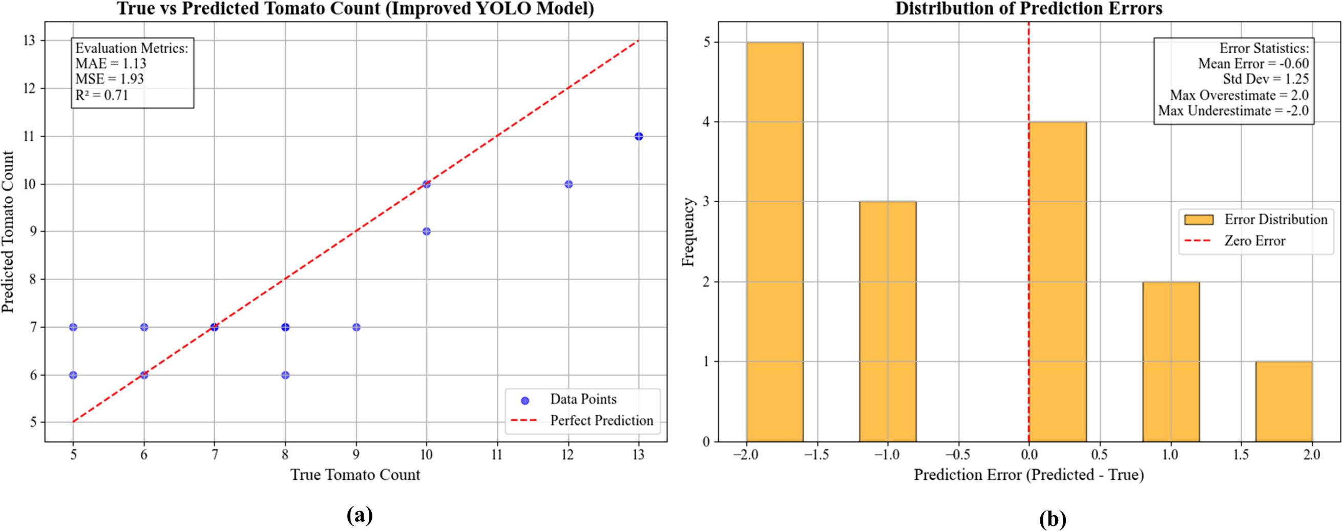 Figure 15. Tomato count and error distribution graph and error distribution histogram (Jetson TX2, PyTorch, MAX-N, 1080p). (a) Scatter plot of true versus predicted tomato counts with model metrics. (b) Histogram showing the distribution of prediction errors.