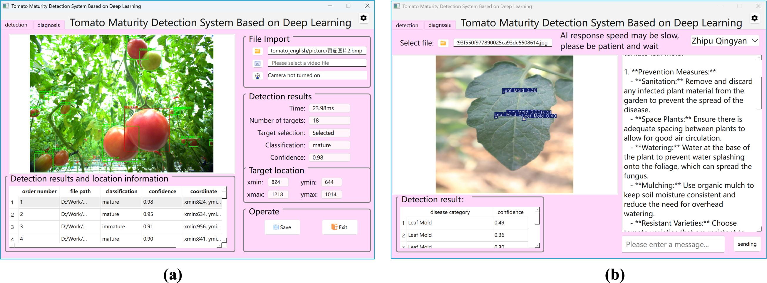 Figure 16. Tomato smart detection and diagnosis software. (a) Tomato detection and growth monitoring module. (b) Disease diagnosis and control module.
