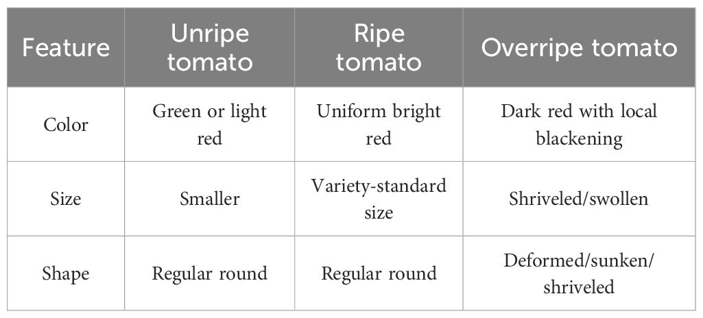 Recent advancements in artificial intelligence (AI) have provided transformative technological support for intelligent agricultural systems. Particularly in tomato production, AI-based computer vision and deep learning technologies have emerged as innovative solutions to conventional harvesting challenges. Studies have demonstrated that agricultural robotic systems equipped with high-precision visual recognition modules are capable of real-time morphological characterization, enabling precise robotic harvesting operations through mechanical arm guidance. The evolution of fruit detection methodologies has witnessed a paradigm shift from traditional approaches to deep learning techniques. Conventional detection methods, including single-feature analysis, multi-feature fusion, and threshold segmentation algorithms, have been shown to exhibit significant limitations when applied to complex tomato growth patterns characterized by fruit occlusion and foliar obstruction. In contrast, deep learning approaches have demonstrated substantial improvements in both recognition accuracy and environmental robustness through autonomous multi-scale feature extraction. This technological advancement provides fundamental support for developing intelligent harvesting systems that address the critical limitations of traditional methods, particularly their inefficiency and labor-intensive nature. Afonso et al. applied MaskRCNN for tomato detection in greenhouse images, by leveraging deep learning to handle variability, implicitly learn depth, and enable accurate fruit counting and background elimination in real-world conditions (Afonso et al., 2020). Liu et al. proposed YOLO-Tomato, an improved YOLOv3 model with dense architecture and circular bounding boxes, enhancing tomato detection accuracy under challenging conditions like occlusion and overlap, outperforming state-of-the-art methods (Liu G. et al., 2020). Liu et al. proposed SM-YOLOv5, a lightweight model based on YOLOv5 and MobileNetV3, achieving 98.8% mAP for small-target tomato detection in plant factories, meeting real-time requirements for picking robots with reduced computational cost (Wang et al., 2023). Wang et al. proposed an improved Faster R-CNN with CBAM and FPN for tomato young fruit detection, achieving 98.46% mAP and 0.084s/image, addressing color similarity, occlusion, and overlap challenges for real-time precision (Wang et al., 2021). Zhou et al. proposed a real-time tomato maturity detection method using YOLOv4 for fruit detection and RGB color analysis with K-means clustering for maturity estimation in greenhouse environments (Zhou et al., 2021). Chen et al. enhanced YOLOv3 for cherry tomato detection by integrating a dual-path network for richer small-target features, multi-scale prediction, and improved K-means++ clustering for anchor box optimization (Chen et al., 2021). Su et al. proposed SE-YOLOv3-MobileNetV1, integrating depthwise separable convolution, Mosaic augmentation, K-means clustering, and SE attention for efficient tomato maturity classification in greenhouse environments, optimized for embedded systems (Su et al., 2022). Rong et al. developed YOLOv5-4D, combining RGB-depth fusion and ByteTrack for tomato cluster tracking, with a specific counting region method to enhance stability and accuracy in greenhouse yield estimation (Rong et al., 2023). Tian et al. proposed TF-YOLOv5s, enhancing YOLOv5s with C3Faster, depth-wise separable convolution, EIoU loss, and SE modules for efficient tomato flower and fruit detection in natural environments, optimized for edge computing deployment (Tian et al., 2024).