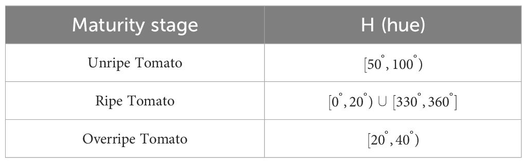 It should be emphasized that in Table 2, the H (Hue) parameter represents color types through angular measurements . This angular representation exhibits two unique characteristics: (1) The range is not mathematically continuous due to its periodic nature (where 0° and 360° represent identical colors), and (2) Distinct maturity stages correspond to specific hue ranges - unripe tomatoes display green/yellow hues , ripe tomatoes exhibit red hues , while overripe tomatoes transition toward orange/brown tones . These hue-based differentiations form the fundamental basis for establishing a robust maturity classification model. The scoring formula based on color as the criterion is given in Equation 9.