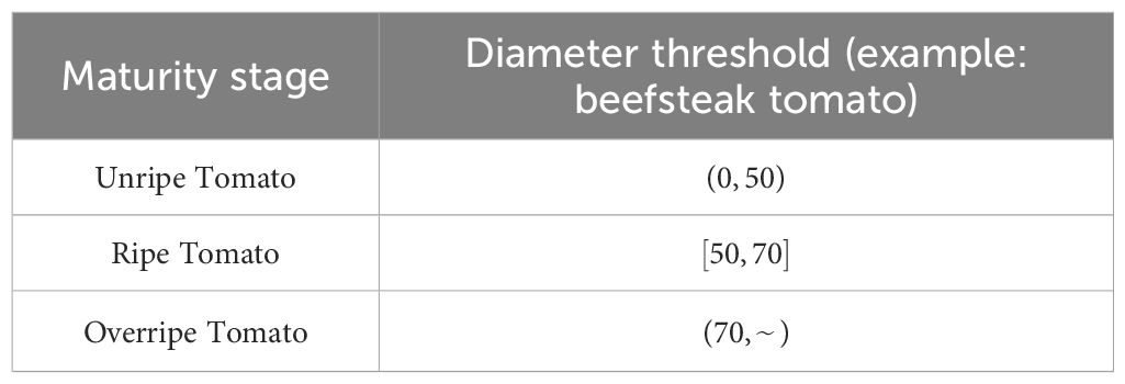 where denotes the maximum diameter of unripe tomatoes, represents the standard diameter of ripe tomatoes, and indicates the minimum diameter of overripe tomatoes. The weight coefficients are typically assigned as , , and based on empirical validation.